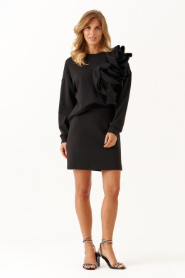 Женский костюм из мягкого трикотажа — комфорт и стиль в каждой детали. Этот изысканный костюм состоит из джемпера и юбки, выполненный из приятного на ощупь мягкого трикотажного полотна. Джемпер отличается прямым силуэтом и оригинальной декоративной полоской на передней части, образующей стильные цветочные мотивы. Спущенная линия плеча и длинные втачные рукава с аккуратными манжетами создают современный, слегка расслабленный образ. Горловина оформлена качественной тесьмой, а низ изделия и рукава обработаны притачными деталями, подчеркивающими аккуратный внешний вид. Для дополнительного комфорта и прочности передняя часть джемпера выполнена на подкладке. Юбка трапециевидного кроя с притачным поясом, внутри которого расположена удобная резинка для идеальной посадки по талии. Две талиевые вытачки на заднем полотнище придают юбке женственный силуэт, подчеркивая фигуру. Костюм выполнен в элегантном черном оттенке — универсальном и практичном, который легко сочетать с аксессуарами и обувью как для делового, так и для повседневного образа.