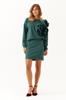 Женский костюм из мягкого трикотажа — комфорт и стиль в каждой детали. Этот изысканный костюм состоит из джемпера и юбки, выполненный из приятного на ощупь мягкого трикотажного полотна. Джемпер отличается прямым силуэтом и оригинальной декоративной полоской на передней части, образующей стильные цветочные мотивы. Спущенная линия плеча и длинные втачные рукава с аккуратными манжетами создают современный, слегка расслабленный образ. Горловина оформлена качественной тесьмой, а низ изделия и рукава обработаны притачными деталями, подчеркивающими аккуратный внешний вид. Для дополнительного комфорта и прочности передняя часть джемпера выполнена на подкладке. Юбка трапециевидного кроя с притачным поясом, внутри которого расположена удобная резинка для идеальной посадки по талии. Две талиевые вытачки на заднем полотнище придают юбке женственный силуэт, подчеркивая фигуру. Юбка выполнена на подкладке. Костюм выполнен в элегантном изумрудном оттенке — универсальном и практичном, который легко сочетать с аксессуарами и обувью как для делового, так и для повседневного образа.