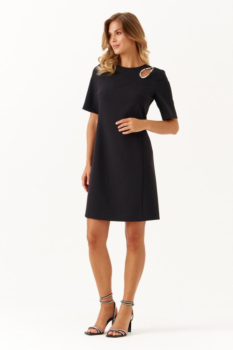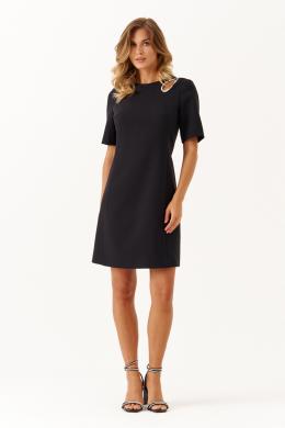 Это стильное платье чёрного оттенка полуприлегающего силуэта выполнено из мягкой и приятной на ощупь поливискозной ткани, идеально подходящей для ежедневных либо торжественных образов. Модель отличается элегантным кроем и оригинальными декоративными деталями. Передняя часть украшена двумя рельефами, идущими от проймы в боковой шов, создающими стройный силуэт. В области талии расположена вышивка, имитирующая пояс, что подчеркивает фигуру и добавляет изящности образу. Горловина оформлена V-образным вырезом с сетчатой вставкой, придающей образу легкую нотку романтики и изысканности. Спинка выполнена со средним швом и застежкой-молнией в шве, а также дополнена шлицей по низу для удобства движений. В области талии расположены две вытачки, подчеркивающие фигуру. Рукава втачные из сетки с короткими воланами создают нежный и женственный акцент. Такой дизайн делает платье универсальным для повседневных прогулок и встреч, сочетая комфорт с оригинальностью деталей.