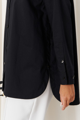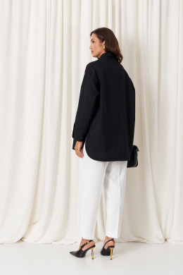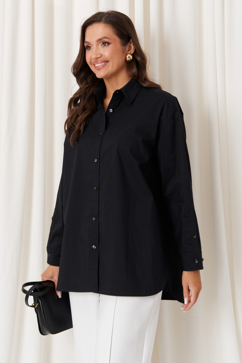 Особенностью дизайна является асимметричный крой: передний край блузки выполнен полукруглым и чуть короче спинки, создавая стильный и современный силуэт. Цвет блузки – чёрный, что делает её универсальной и легко сочетаемой с различными нарядами. Эта блузка станет отличным дополнением гардероба, сочетая комфорт с элегантностью и классикой.