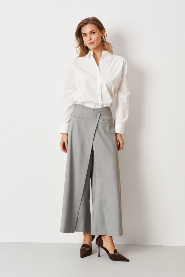 Горловина оформлена классическим рубашечным воротником, создающим аккуратный и строгий вид. Линия плеча спущена, что добавляет свободного и непринужденного стиля. Рукава втачные, с низом, обработанным притачной манжетой. Низ рукавов также украшен двумя застежками, что дополнительно подчеркивает детализацию изделия.