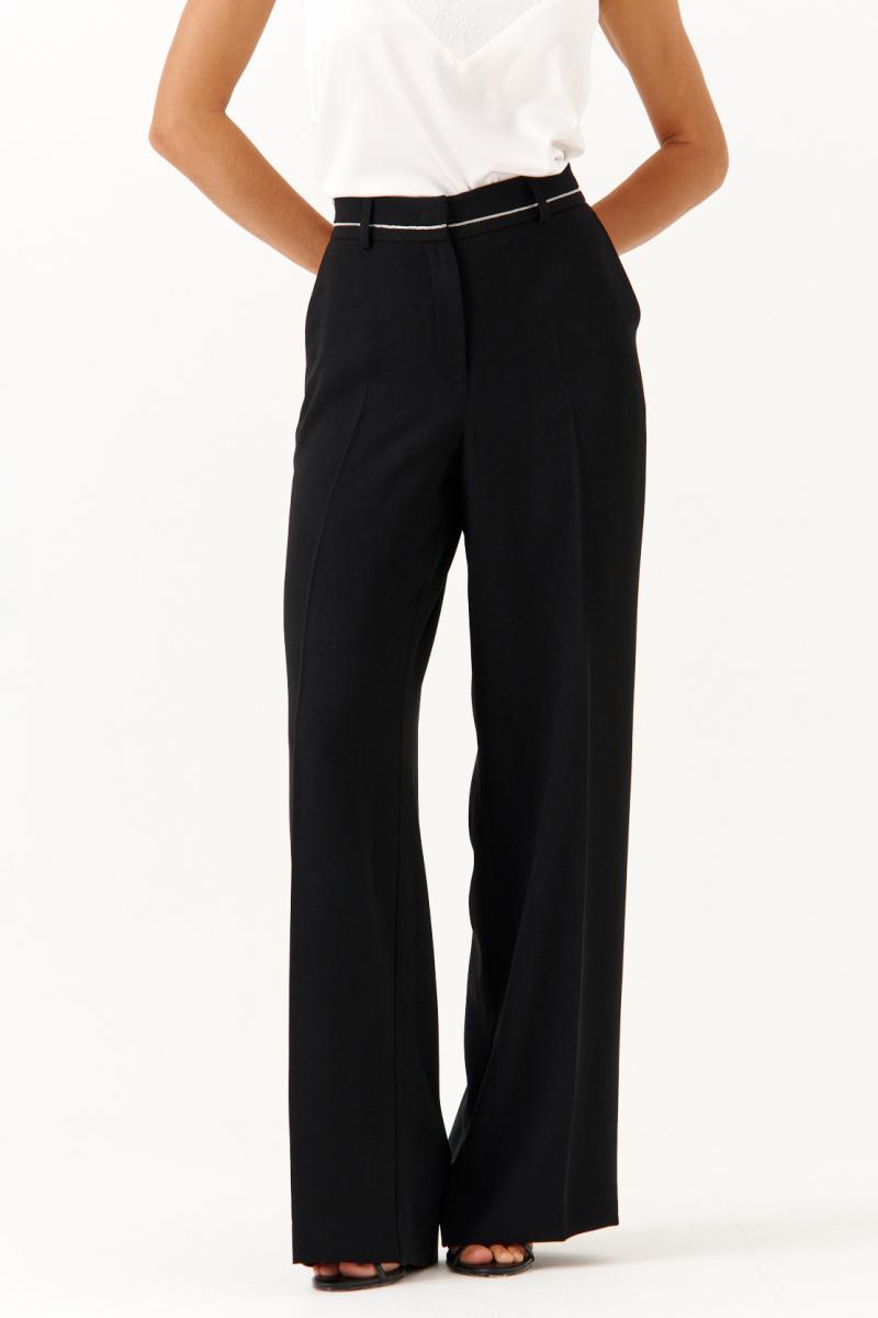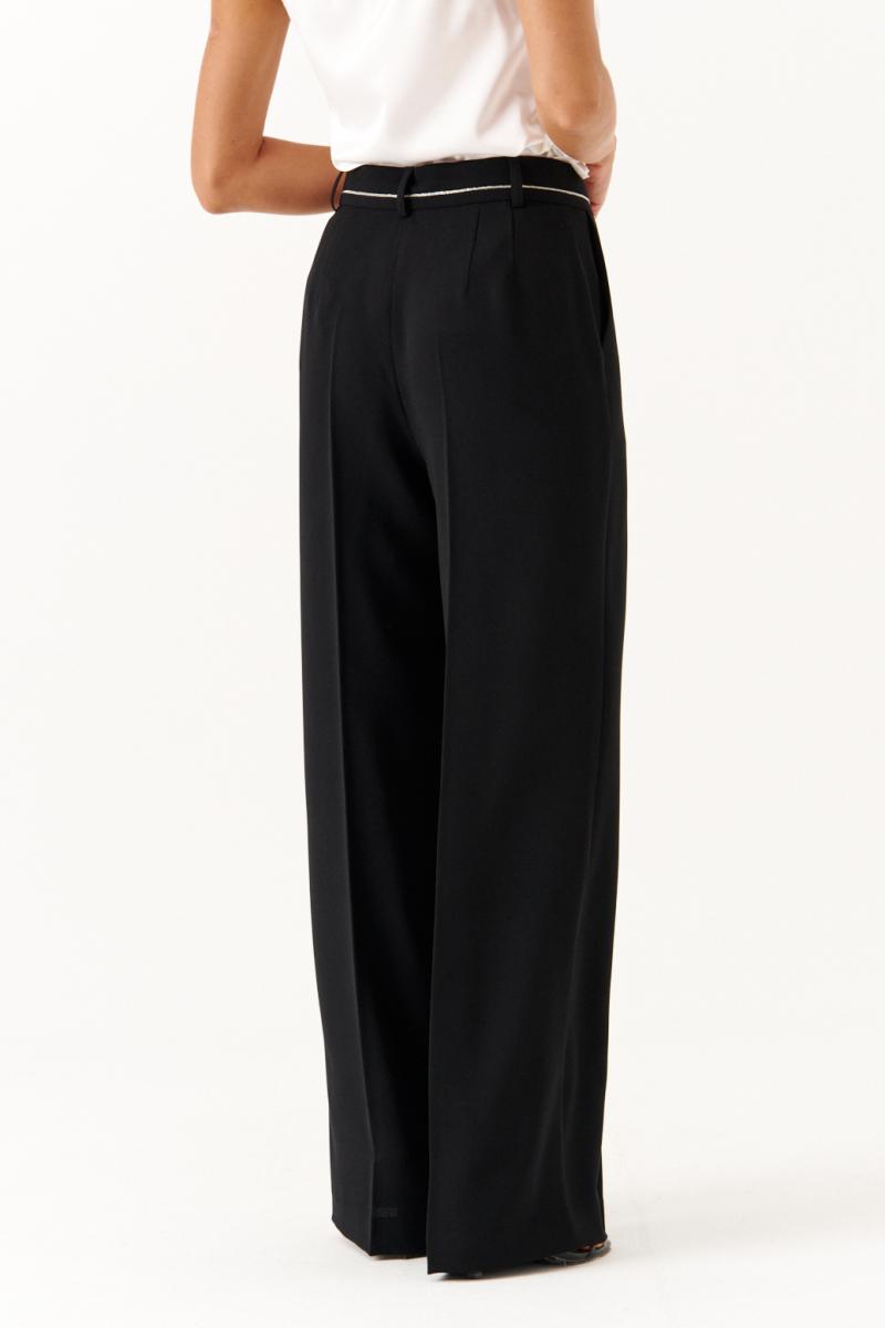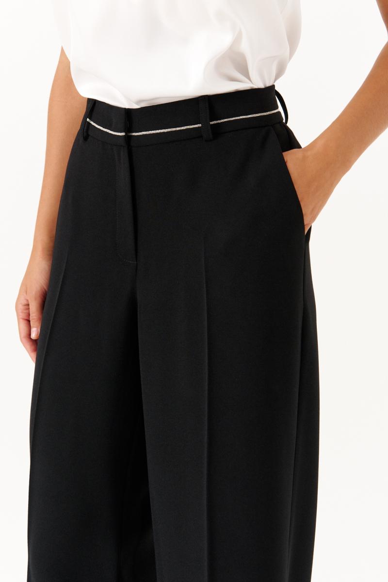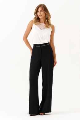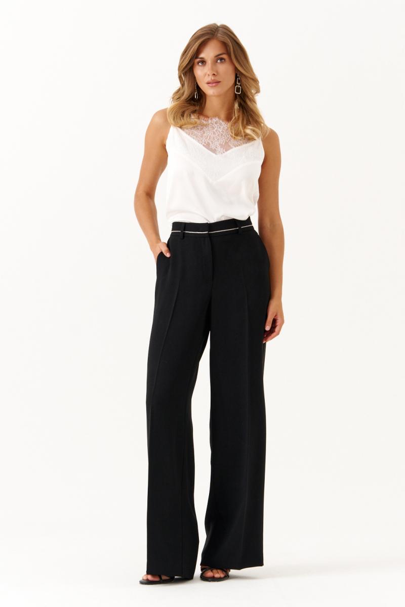 Эти женские брюки выполнены из струящейся ткани и предназначены для повседневной носки либо торжественных случаев. Модель обладает свободным кроем, обеспечивающим комфорт и свободу движений. В брюках заутюжены стрелки. В боковых швах карманы. Верхний срез брюк обработан поясом, по поясу есть шлёвки для ремня, что позволяет регулировать объем по талии. Застёжка в среднем шве на молнию и крючок. По задним половинкам по талии есть вытачки. Длина классическая. Такие брюки отлично подходят для создания легких, стильных образов в повседневной жизни и легко сочетаются с различными топами и обувью.