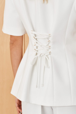 Женский жакет из поливискозной ткани выполнен в полуприлегающем силуэте, идеально подходящем для повседневной носки. Модель выполнена в бежевом оттенке и оснащена мягкой поливискозной подкладкой. Перед жакета украшен вытачками, которые создают аккуратную форму, а по передней части расположен декоративный клапан. Перед с отрезным бочком, что обеспечивает комфортную посадку. Спинка с вертикальными рельефами, проходящими от плечевых швов до линии низа, а также корсетной шнуровкой, позволяющей регулировать облегание и достигать идеально посадку. Край борта рельефный. Застежка центральная, бортовая, выполненная на обметанные петли и пуговицы, что добавляет классический акцент к дизайну. Горловина обработана пиджачным воротником, который придает образу деловой элегантности, рукава втачные и достигающие уровня локтя, обеспечивает удобство и комфорт. Благодаря использованию качественной ткани и современному крою этот жакет станет универсальным предметом гардероба, идеально сочетающимся как с деловым стилем, так и с повседневной одеждой.