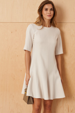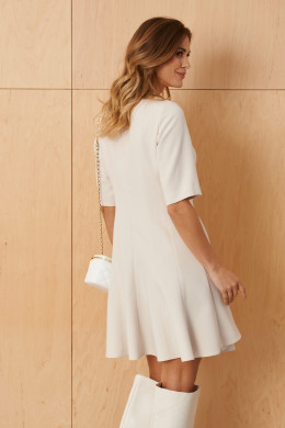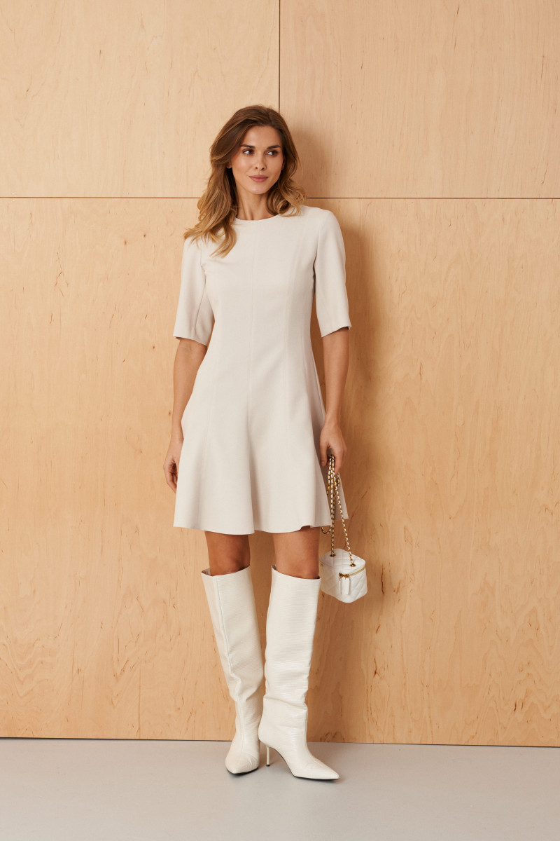 Это женское платье из поливискозной ткани, идеально подходящее для повседневной носки. Модель выполнена в нейтральном бежевом цвете и отличается элегантностью и комфортом. Передняя часть украшена средним швом и рельефами, которые идут от проймы и от плечевого шва до линии низа, создавая плавные линии и легкий объем. Спинка также выполнена со средним швом, дополнена рельефами, начинающимися от проймы и плечевого шва и идущими до линии низа, что придает силуэту стройность и изящность. В среднем шве спинки расположена потайная молния, обеспечивающая удобство при надевании. Нижняя часть платья, расклешённая к низу, что создает свободный и женственный силуэт. Горловина круглая, добавляя образу мягкости. Втачные рукава длиной чуть ниже локтя делают изделие универсальным. Длина платья достигает колен, что делает его практичным и актуальным вариантом для повседневных выходов.