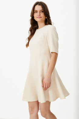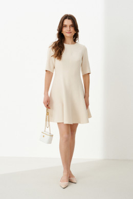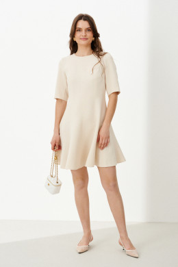Это женское платье из поливискозной ткани, идеально подходящее для повседневной носки. Модель выполнена в нейтральном светло-бежевом цвете и отличается элегантностью и комфортом. Передняя часть украшена средним швом и рельефами, которые идут от проймы и от плечевого шва до линии низа, создавая плавные линии и легкий объем. Спинка также выполнена со средним швом, дополнена рельефами, начинающимися от проймы и плечевого шва и идущими до линии низа, что придает силуэту стройность и изящность. В среднем шве спинки расположена потайная молния, обеспечивающая удобство при надевании. Нижняя часть платья, расклешённая к низу, что создает свободный и женственный силуэт. Горловина круглая, добавляя образу мягкости. Втачные рукава длиной чуть ниже локтя делают изделие универсальным. Длина платья достигает колен, что делает его практичным и актуальным вариантом для повседневных выходов.