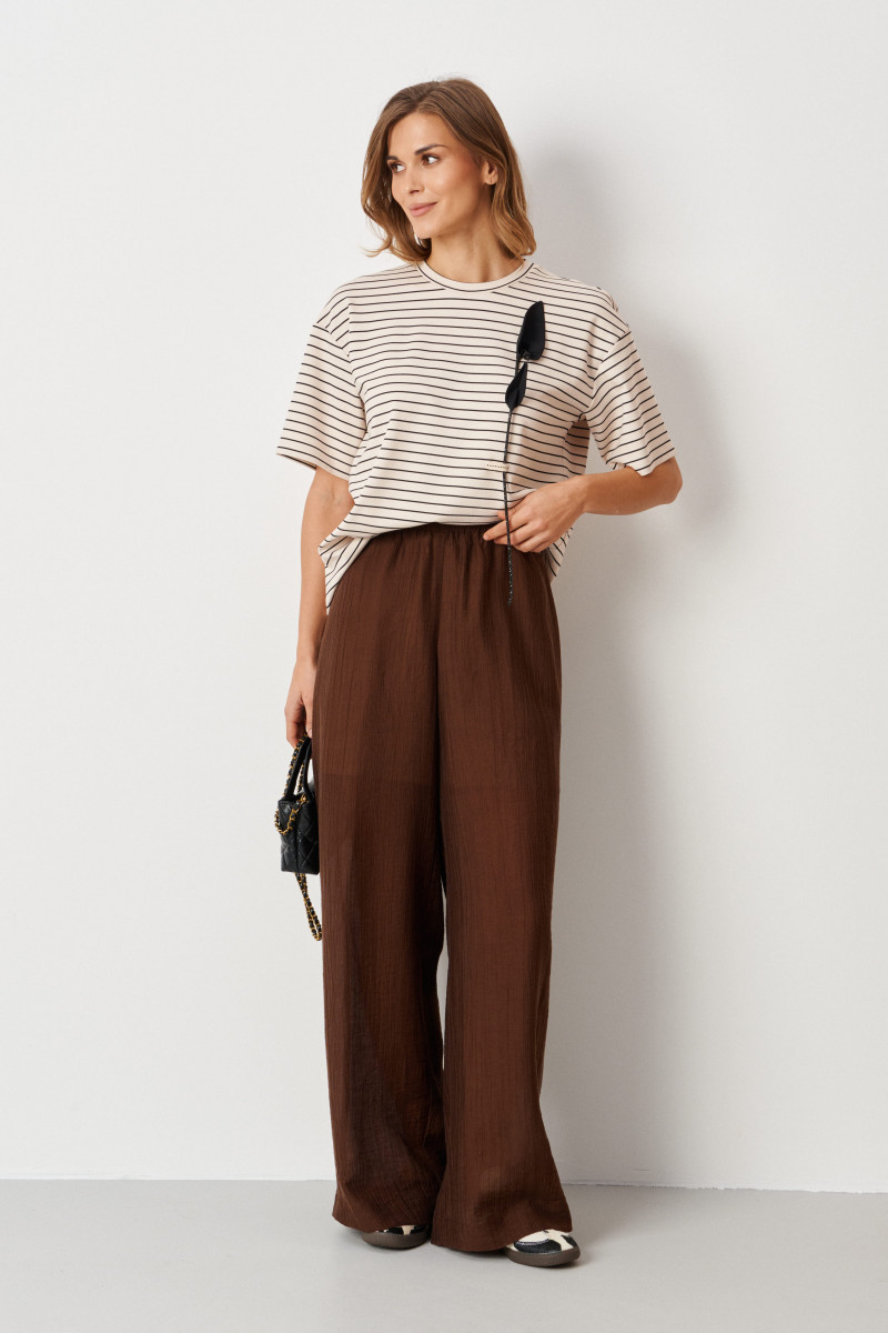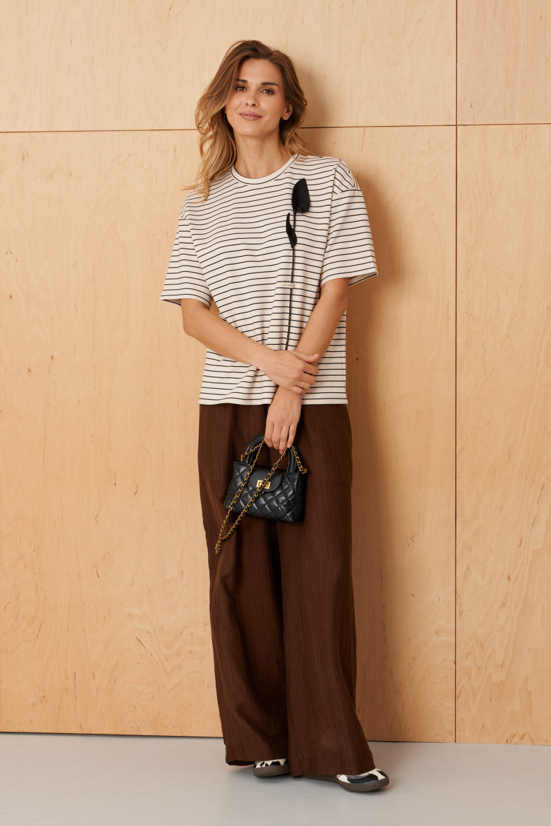 Женский джемпер из поливискозного трикотажного полотна с изящным полосатым рисунком. Модель выполнена в прямом силуэте, что обеспечивает универсальность и легкость в сочетании с различными вещами. Передняя часть украшена декоративным элементом с блестящим шнуром в форме стебля, что придает образу яркий и оригинальный акцент. Горловина обработана окантовочной тесьмой, что подчеркивает аккуратность и завершенность дизайна. Линия плеча спущена, что создает более расслабленное и свободное ощущение при ношении, а рукава втачные длиной чуть ниже локтя делают модель особенно комфортной и актуальной. Молочный оттенок джемпера делает его универсальным и легким для сочетания с разными цветами и стилями. Такой джемпер отлично подойдет для повседневного образа, добавив нотки элегантности и уютности.