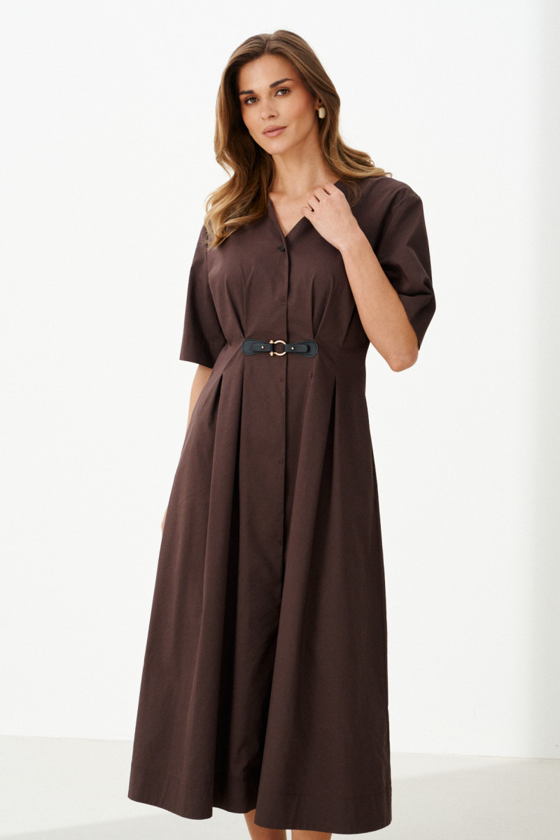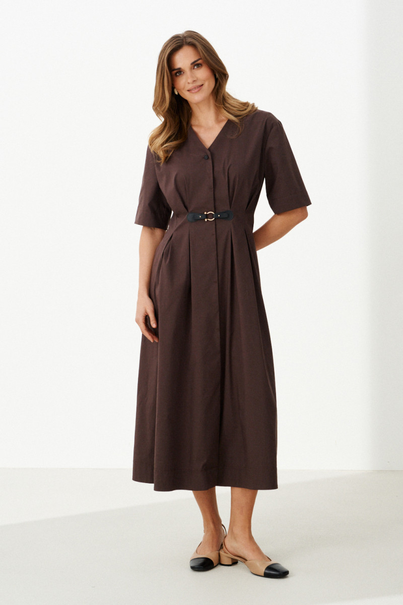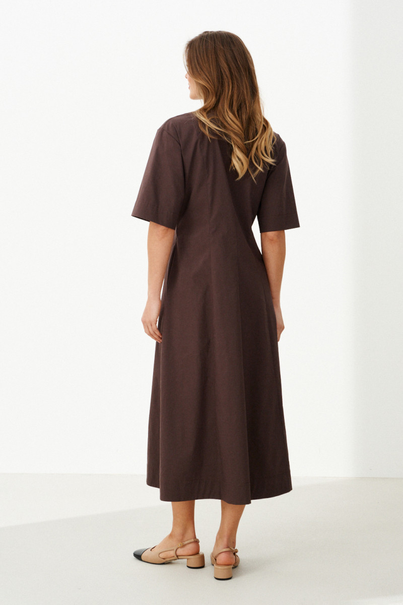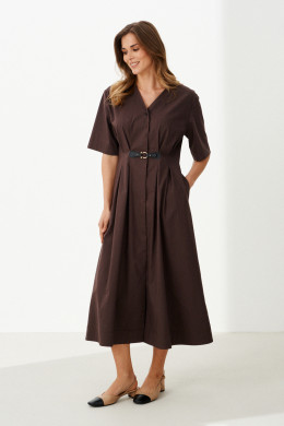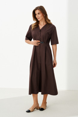 Это женское повседневное платье из мягкой хлопковой ткани, идеально подходящее для ежедневной носки. Модель выполнена в коричневом цвете и имеет длину до щиколотки, что придает ей элегантный и комфортный вид. Передняя часть украшена аккуратными защипами и декоративной деталью, которая подчеркивает оригинальность дизайна. Спинка платья оснащена средним швом и двумя вертикальными рельефами, начинающимися от плечевого среза и идущими до линии низа, что создает стройный силуэт и добавляет интересных деталей к крою. Застежка расположена по центру и выполнена в виде скрытой бортовой потайной линии на обметанных петлях, с одной видимой пуговицей, что обеспечивает аккуратный внешний вид и комфорт при надевании. Воротник выполнен в V-образной форме, что разнообразит образ и добавляет женственности. Рукава втачные длиной чуть ниже локтя обеспечивают свободу движений и практичность. Это универсальное платье идеально подойдет для повседневных прогулок, встреч с друзьями или работы, сочетаясь с различными аксессуарами и обувью.