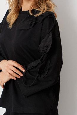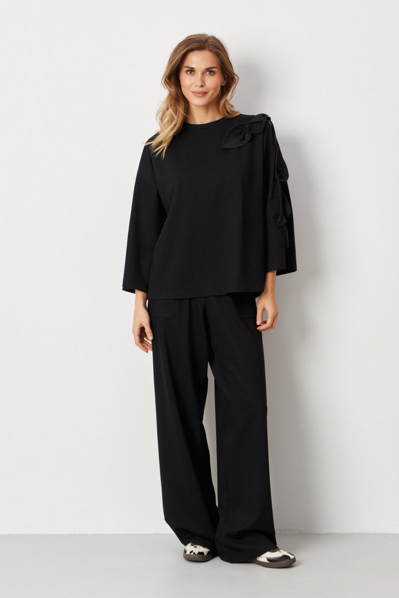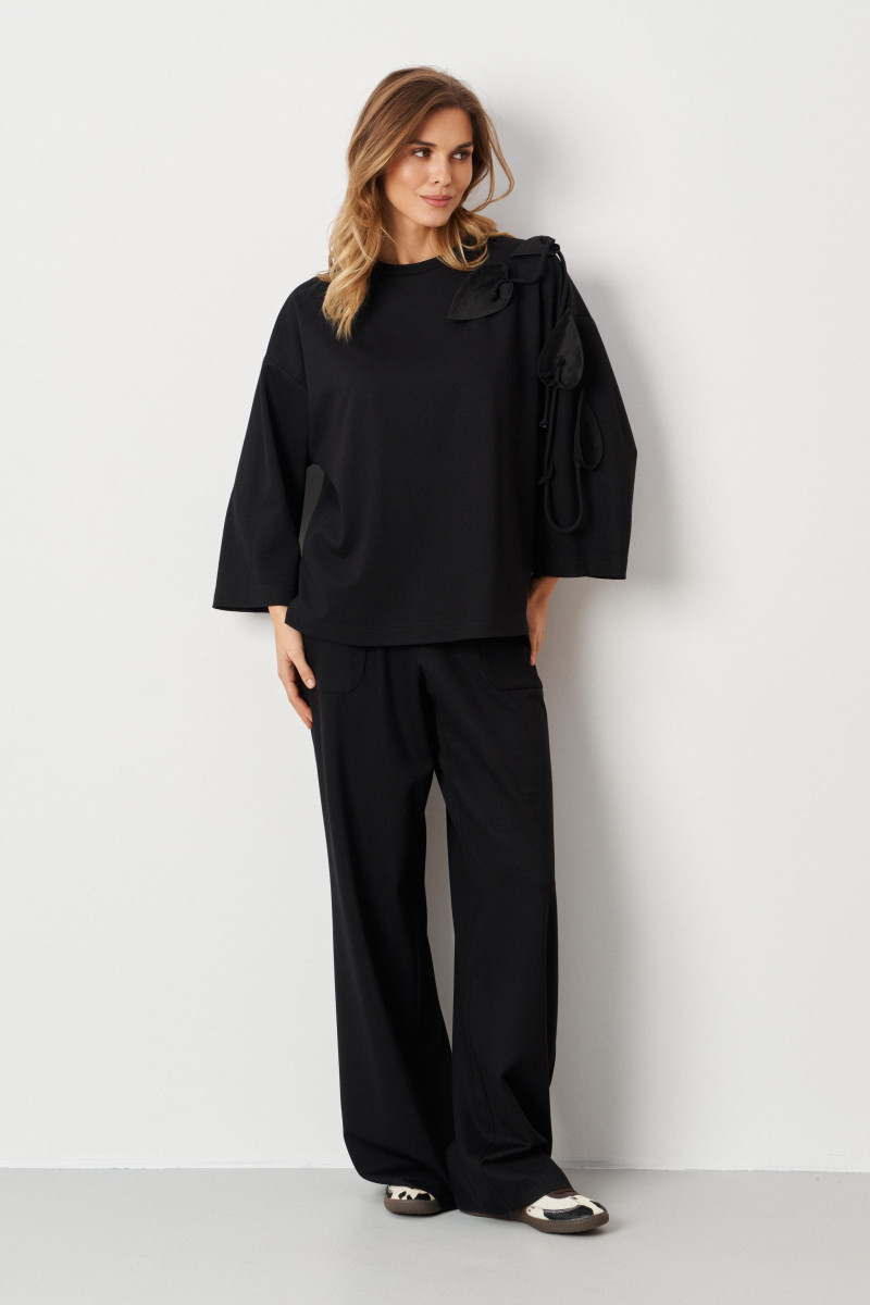 Этот женский костюм выполнен из мягкого трикотажного полотна с большим добавлением хлопка, что делает его приятным к телу, комфортным и хорошо держащим форму. Комплект состоит из просторного джемпера и прямых брюк, создавая стильный и универсальный образ. Джемпер отличается прямым силуэтом с линией плеча, спущенной для большей свободы движения. Горловина аккуратно обработана окантовочной тесьмой, что добавляет изделию завершенности и аккуратности. Рукава у джемпера длинные и втачные, что обеспечивает плотную посадку и комфорт при носке. Передняя часть украшена декоративными лепестками, которые идут от рукавов и создают выразительный эффект. Брюки имеют классический прямой покрой и обработаны верхний срез притачным поясом с вставкой на резинке, обеспечивающим хорошую и удобную посадку. Передняя часть брюк украшена накладными карманами с подкройным бочкам, что придает образу функциональности и стильности. Костюм выполнен в чёрном оттенке, что делает его универсальным для создания как повседневных, так и более элегантных образов. Такой комплект прекрасно подойдет для комфортных будней, прогулок или повседневных встреч, легко сочетаясь с различными аксессуарами и обувью.