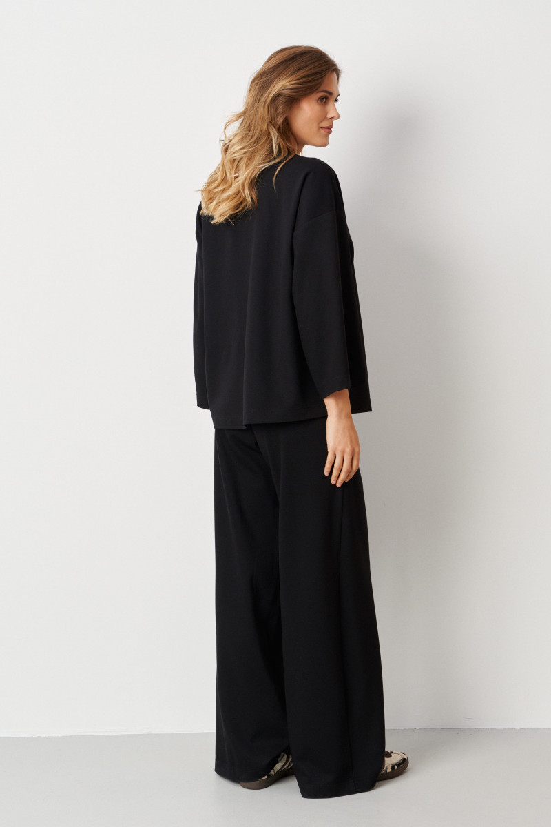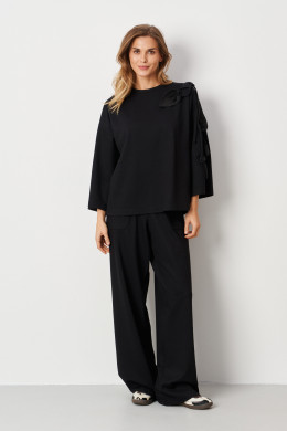 Этот женский джемпер выполнен из мягкого трикотажного полотна с большим добавлением хлопка, что делает его особенно приятным к телу, комфортным в носке и хорошо сохраняющим форму. Модель обладает прямым силуэтом с линией плеча, выполненной в спущенном стиле, что обеспечивает свободную и расслабленную посадку, а также легкость движений. Горловина аккуратно обработана окантовочной тесьмой, что придает изделию завершенный и аккуратный внешний вид, подчеркивая его стильность. Длинные втачные рукава плотно облегают руки, создавая комфорт и аккуратность в посадке. Передняя часть украшена декоративными лепестками, которые начинаются от рукавов и идут вниз, создавая выразительный и оригинальный эффект, привлекающий внимание и добавляющий модели изюминку. Джемпер выполнен в классическом черном оттенке, что делает его универсальным и легким в сочетании с различными предметами гардероба, позволяя создавать как повседневные, так и более элегантные образы.