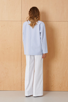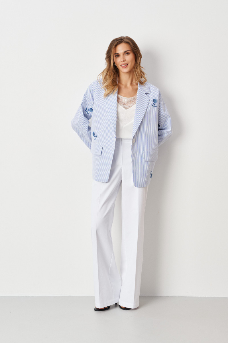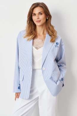 Этот женский жакет выполнен из костюмной ткани с добавлением хлопка, что делает его одновременно элегантным и приятным к телу. Жакет на качественной хлопковой подкладке. Модель имеет центральную бортовую застежку на обметанную петлю и одну пуговицу, обеспечивая удобство и аккуратность посадки. Передняя часть украшена дизайнерской вышивкой в виде цветов, которая придает изделию изысканный и нотки утонченности. На передней части также располагаются накладные клапаны, имитирующие карманы, что создает эффект обманки — элемент декоративной отделки, добавляющий интересный акцент к дизайну. Спинка жакета выполнена с центральным швом, что обеспечивает хорошую посадку и структурированность модели. Горловина обработана пиджачным воротником, придающим жакету классический стиль и эффект завершенности. Длинные втачные рукава позволяют свободно двигаться и создают аккуратный внешний вид. Жакет выполнен в бело-синем оттенке с полоской, что делает его универсальным и стильным элементом гардероба, подходящим для различных повседневных и деловых образов.