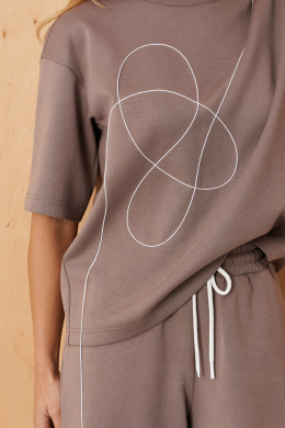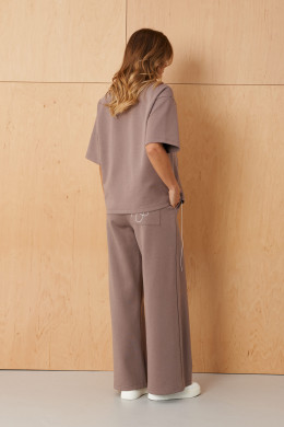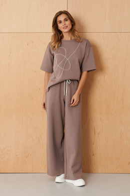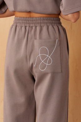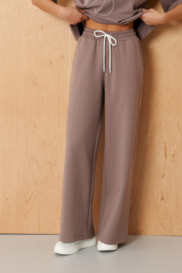 Эти женские брюки выполнены из мягкого и приятного к телу трикотажного полотна с высоким содержанием хлопка, что обеспечивает комфорт и отличную посадку. Классический прямой крой делает их универсальными и стильными. Верхняя часть брюк украшена притачным поясом с вставкой на резинке и шнурками, что позволяет регулировать посадку по фигуре. Задние накладные карманы с декоративной вышивкой шнуром придают образу особую изысканность и стильность, а боковые швы с подкройным бочком обеспечивают дополнительную функциональность. Цвет мокко делает эти брюки легкими для сочетания с разнообразными топами и обувью, создавая свежий и современный образ. Эта модель отлично подойдет для повседневных прогулок, деловых встреч или уютных встреч с друзьями, подчеркивая неповторимый стиль и комфорт в каждом дне.