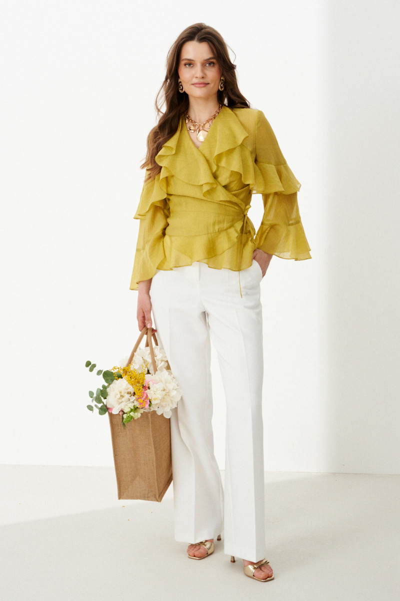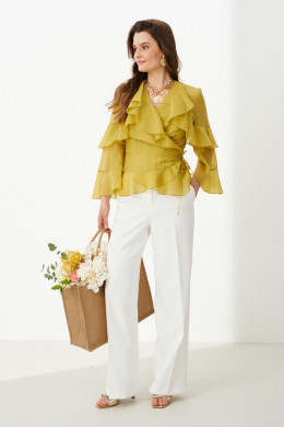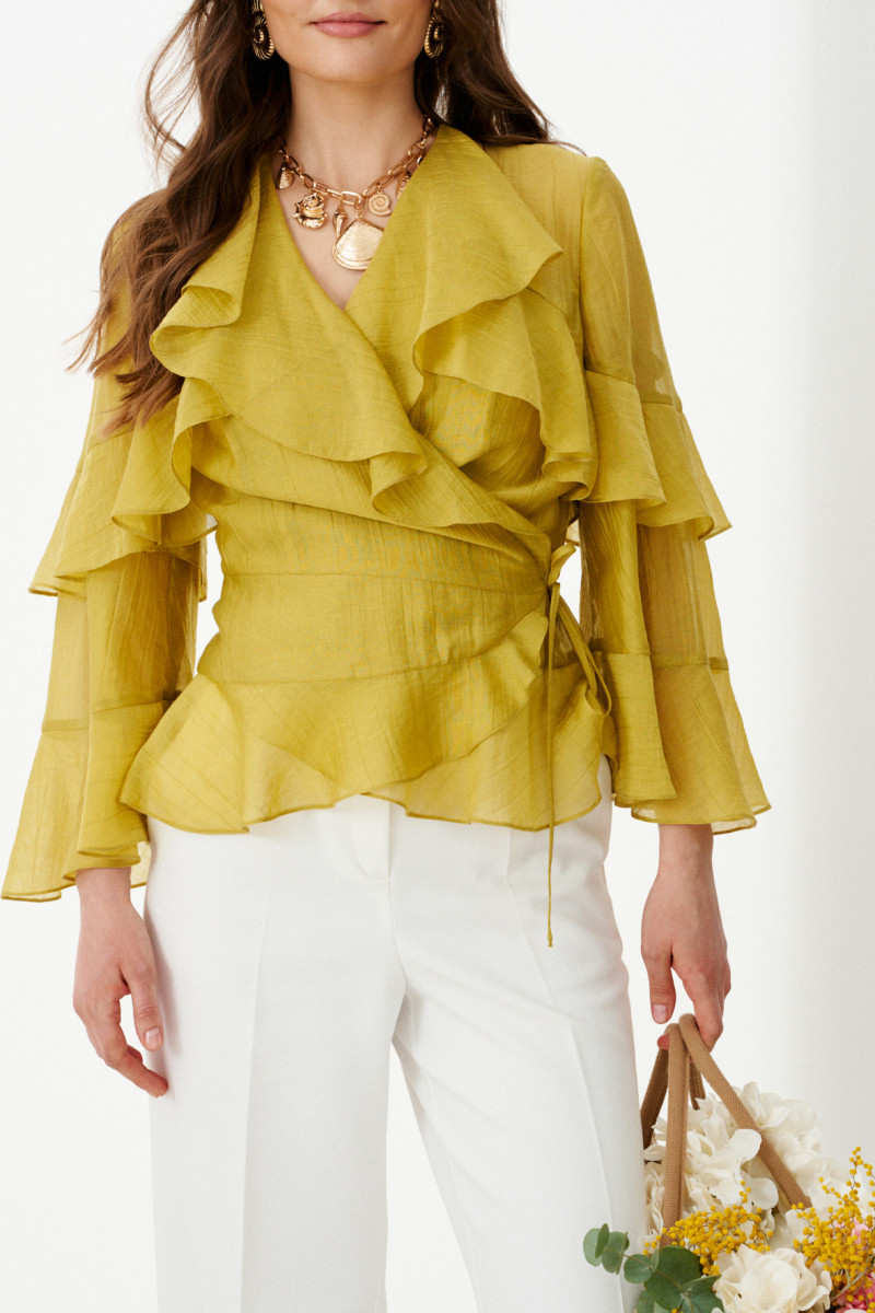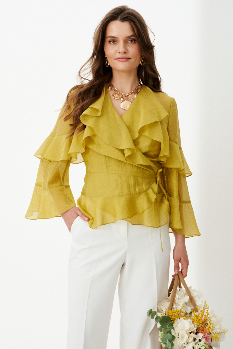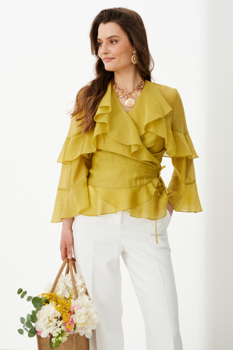 Это элегантная женская блузка из струящейся, мягкой ткани оливкового оттенка, созданная для тех, кто ценит изысканную детализацию и комфорт в одном изделии. Силуэт полуприлегающий, подчеркивающий естественные линии фигуры, при этом сохраняющий свободу движений благодаря воздушной фактуре ткани. Блузка выполнена на запах — этот классический элемент придает образу нотку романтики и позволяет легко регулировать посадку. Визуальную глубину и динамику придают притачные воланы, отрезные декоративные подрезы. На передней части вертикальные рельефы, начинаясь от верхнего волана, стремительно уходят вниз, подчеркивая талию и удлиняя силуэт, а на спинке кокетка с двумя вертикальными рельефами, добавляющими изящную структуру. V-образная горловина создает легкую, но выразительную линию, идеально дополняемую втачными рукавами длиной ¾. Рукава украшены нежными воланами, которые придают образу воздушность и артистичность. Благодаря продуманной конструкции, качественным материалам и утончённому дизайну эта блузка станет идеальным выбором для праздничных ужинов, прогулок в городском парке или романтических вечеров —она создаёт настроение.