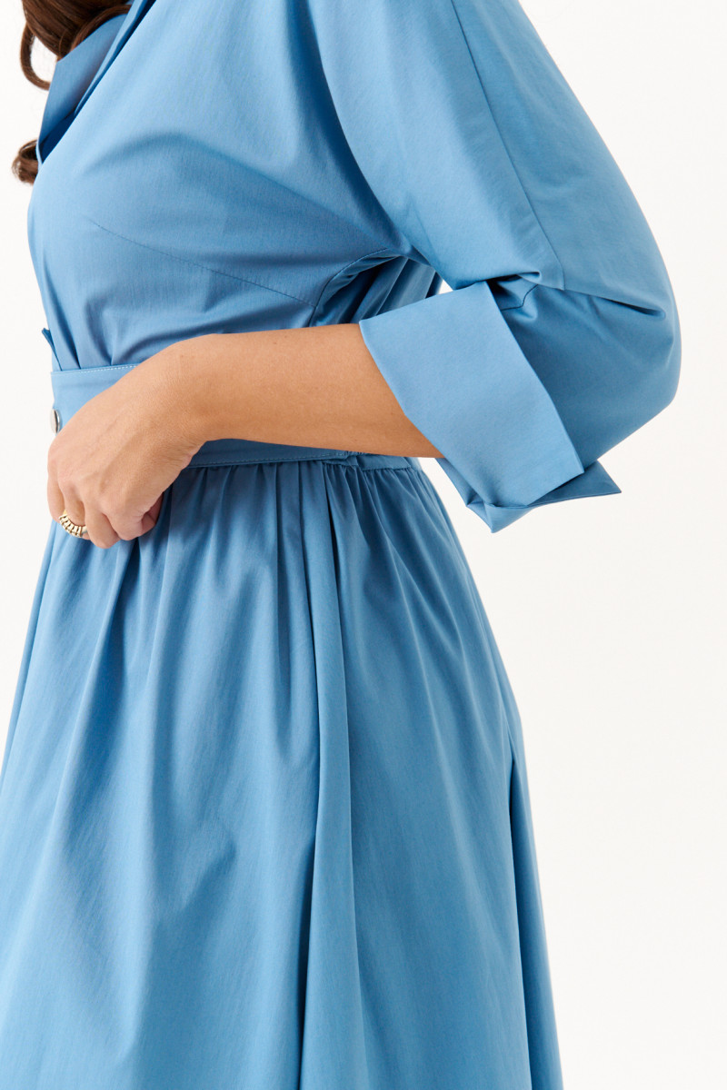 Платье женское из хлопковой ткани для повседневной носки. Без подкладки. Платье полуприлегающего силуэта. Длина изделия ниже колена. В боковых швах прорезные карманы. Рукав три четверти с манжетой. Платье укомплектовано поясом из основной ткани изделия.