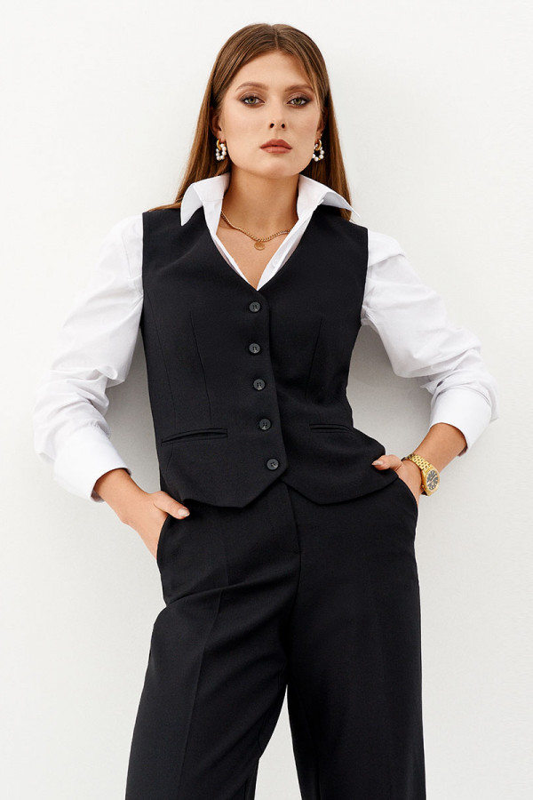 Жилет женский в классическом стиле - современная база женского гардероба. Классический жилет выполнен из костюмной ткани с V-образным вырезом, полуприлегающего кроя, подходит для образов в офис, в университет, в школу, на каждый день. Жилетка короткая на пуговицах имеет подкладку из вискозы, ее можно надевать под пиджак как первый слой (тренд сезона), под кардиган, а также сочетать с шелковыми топами, блузками женскими, водолазками, рубашками. Дополни жилеткой классическую прямую юбку, юбку мини, женские прямые брюки или брюки палаццо и даже джинсы!