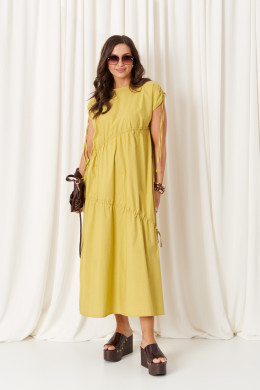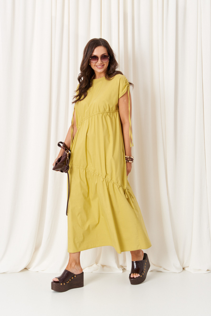 Платье женское из смесовой ткани для повседневной носки прямого силуэта. Перед и спинка имеют декоративные подрезы с вставленной кулисой, затягивающейся на шнурок. Горловина обработана обтачкой. Плечевой срез обработан декоративными подрезами с вставленной кулисой, затягивающейся на шнурок. Платье будет прекрасным вариантам на все случаи жизни, легкое и утонченное, а главное очень комфортное в носке.