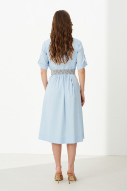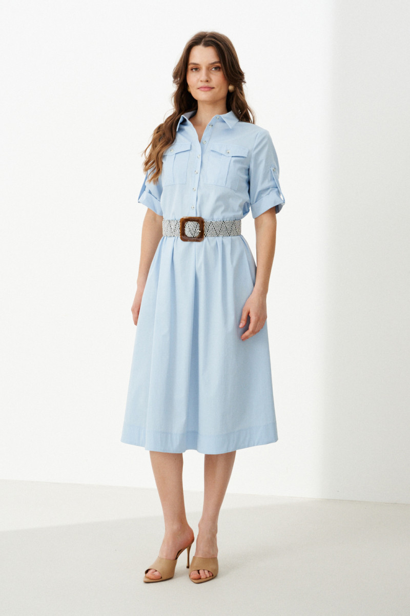 Платье миди – модная модель сезона, которая вашу фигуру стройнее, благодаря приталенному силуэту и ремешку. Платье с воротником рубашечного типа, нагрудными и прорезными боковыми карманами смотрится стильно, лаконично. Рукава с манжетами и патами открывают изящные линии рук. Платье рубашка из хлопкового полотна – мягкое, приятное на ощупь. Оно отлично отводит влагу, пропускает воздух, не сминается. Вы можете купить женское платье в комплекте с красивым съемным декоративным поясом.