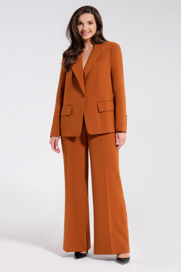 Удлиненный женский жакет в передней части имеет прорезные карманы с клапанами. В качестве застежки и декора, размещенного по низу длинных рукавов, используются золотистые пуговицы.