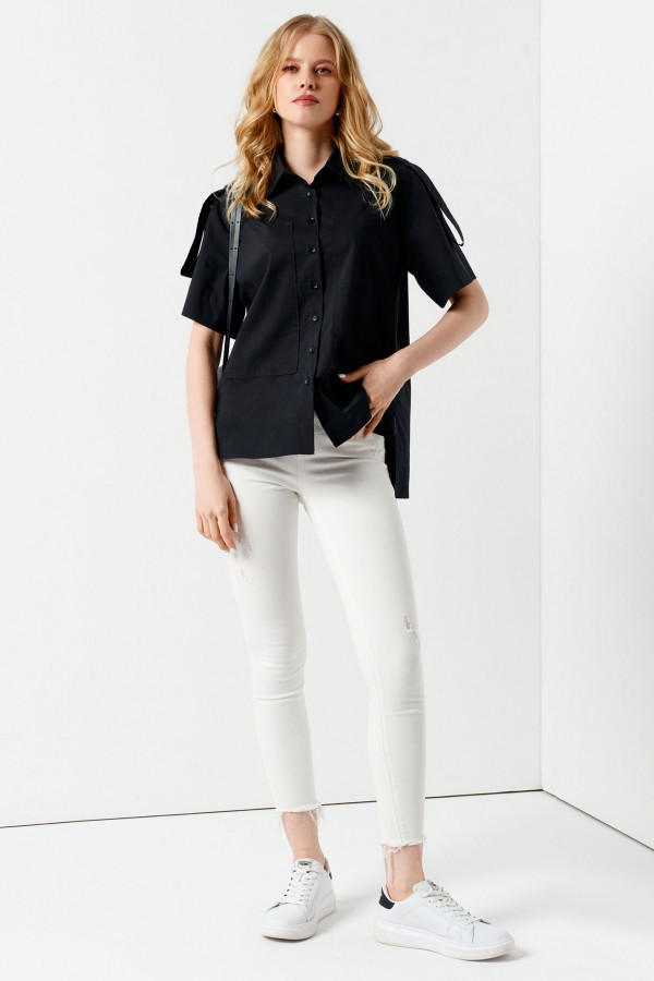 Изящная блузка из костюмной ткани дополненное кружевом по переду. Блузка полуприлегающего силуэта, с рукавами длиной три четверти. Блузка с небольшой стойкой по горловине, с застежкой на потайную молнию по спинке. Блузка дополнена съёмной декоративной брошью.