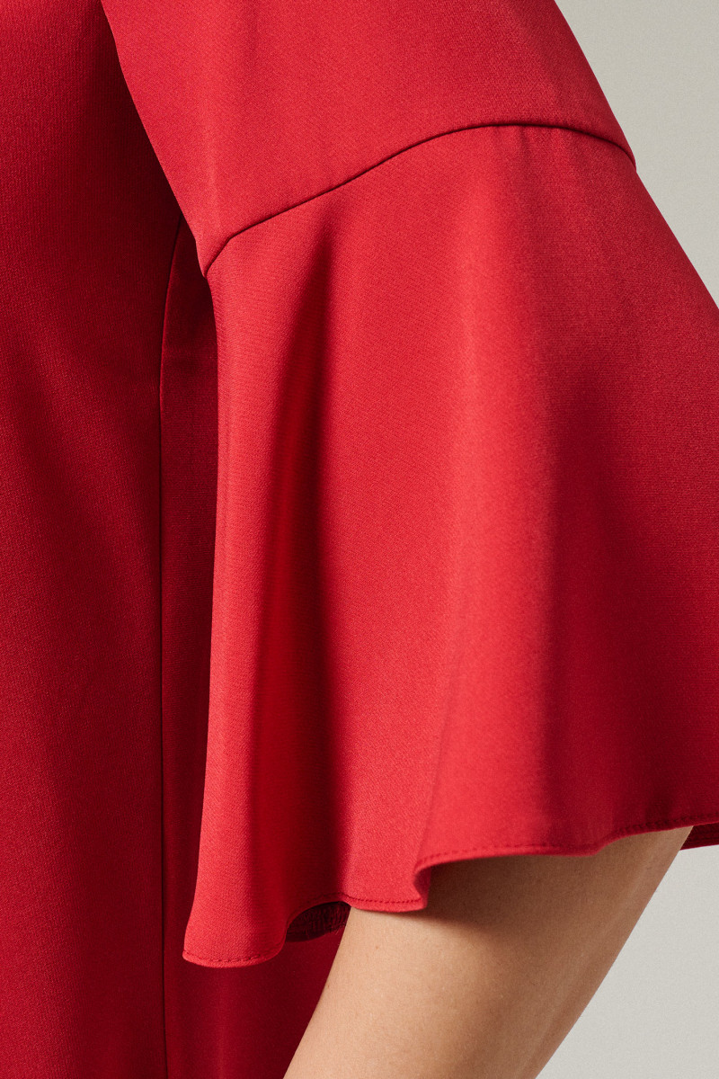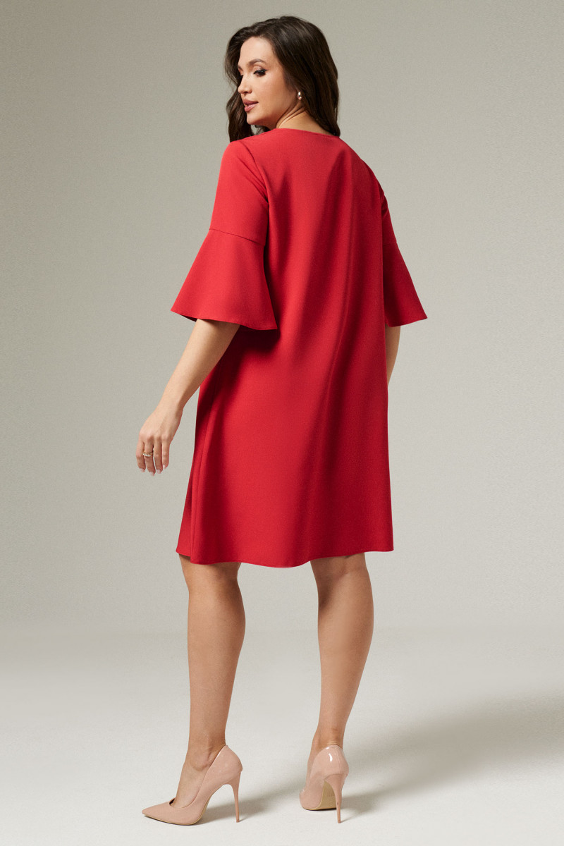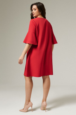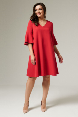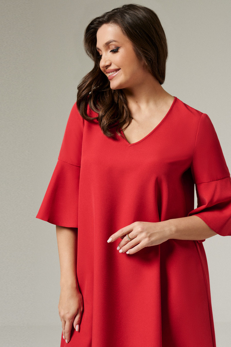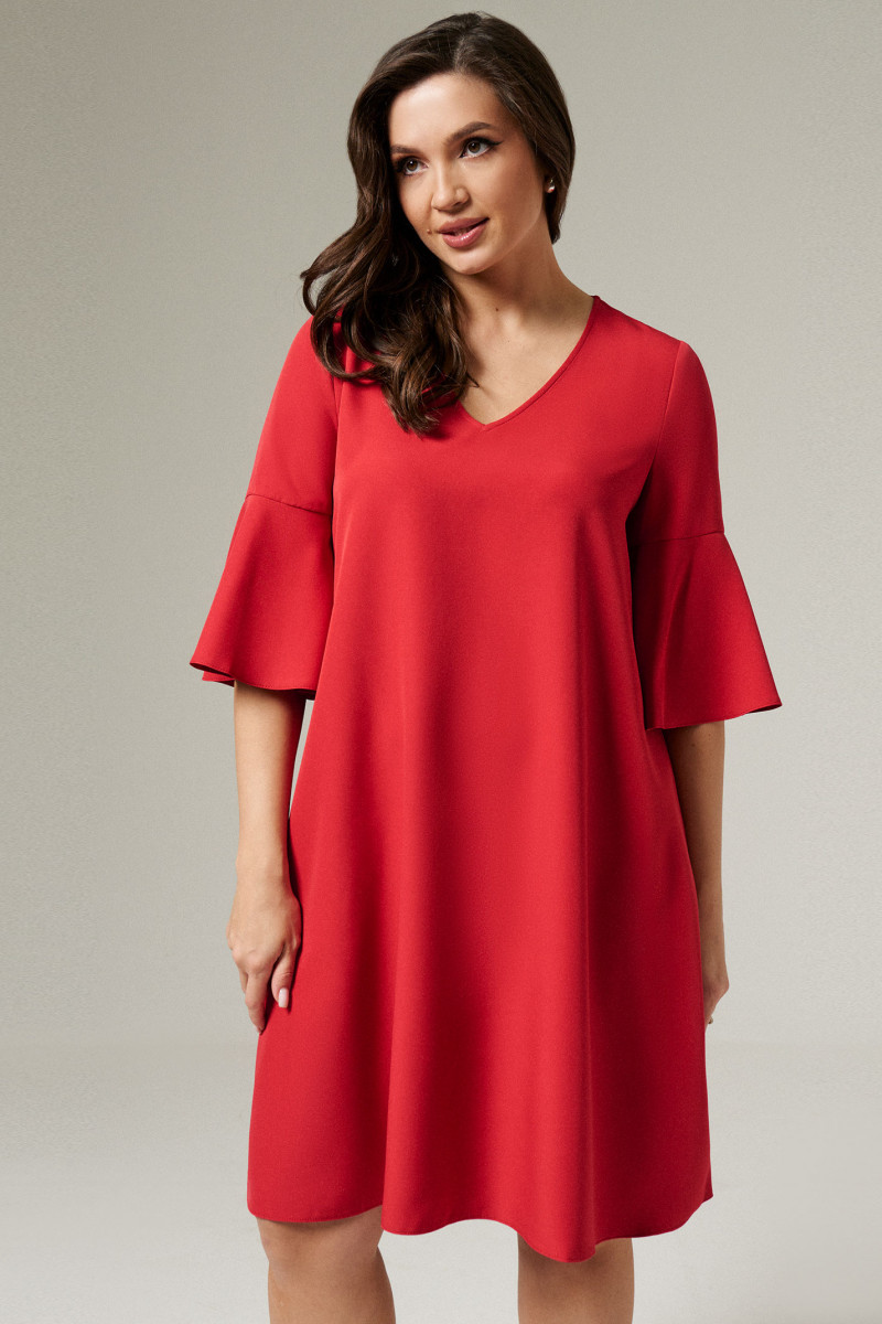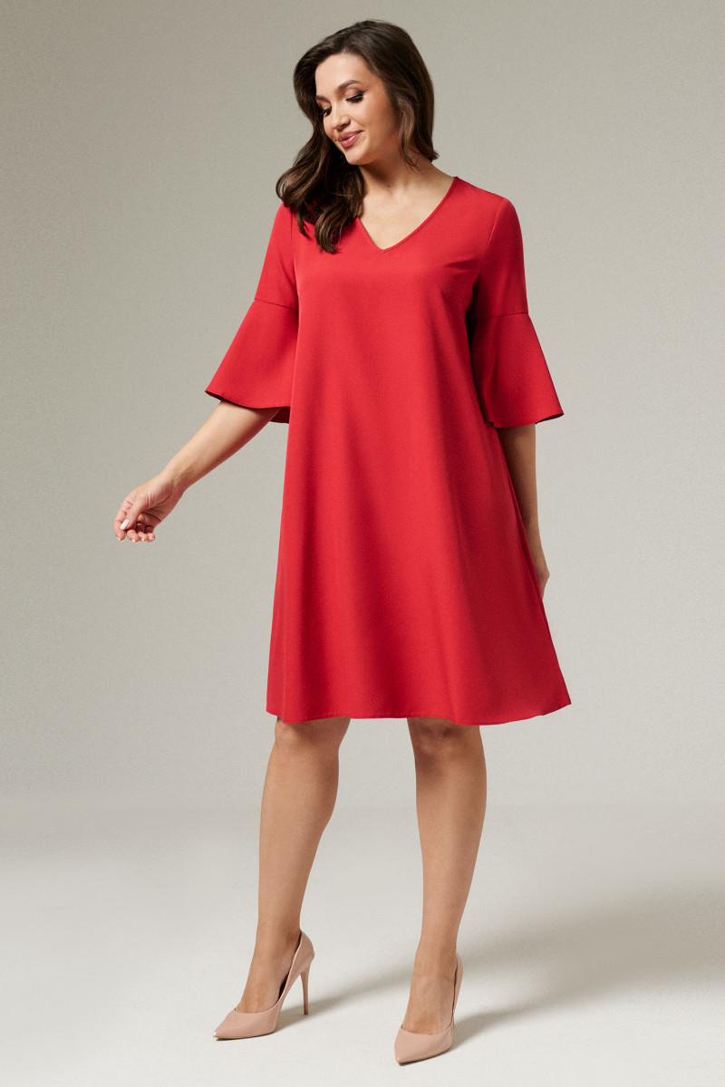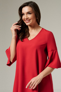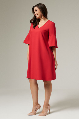 Платье женское из лёгкой ткани для повседневной носки. Платье, расширяющееся к низу с V--образной горловиной. Рукава оформлены воланом. Длина изделия до колена.