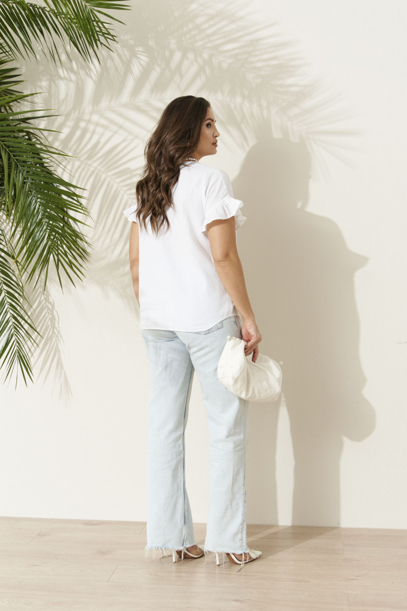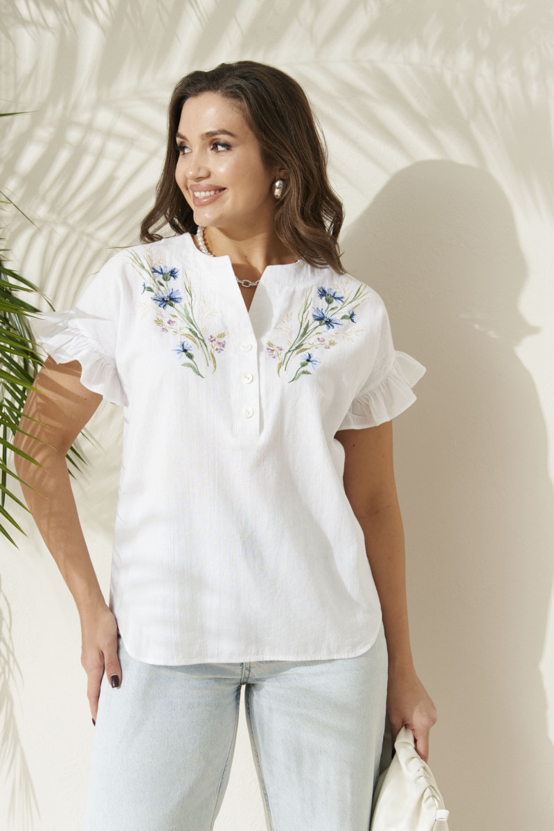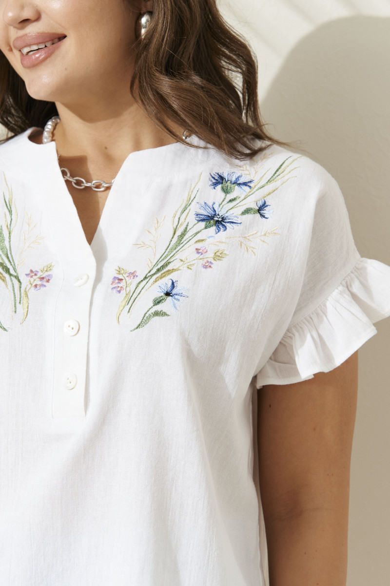 Блуза женская из хлопчатобумажной ткани для повседневной носки. Горловина с V-образным вырезом и планкой, застежка на обметанные петли и пуговицы. Рукав короткий, оформленный рюшей. На переде располагается дизайнерская вышивка в виде цветов василька. В данной блузке вы будете выглядеть безупречно и элегантно.
