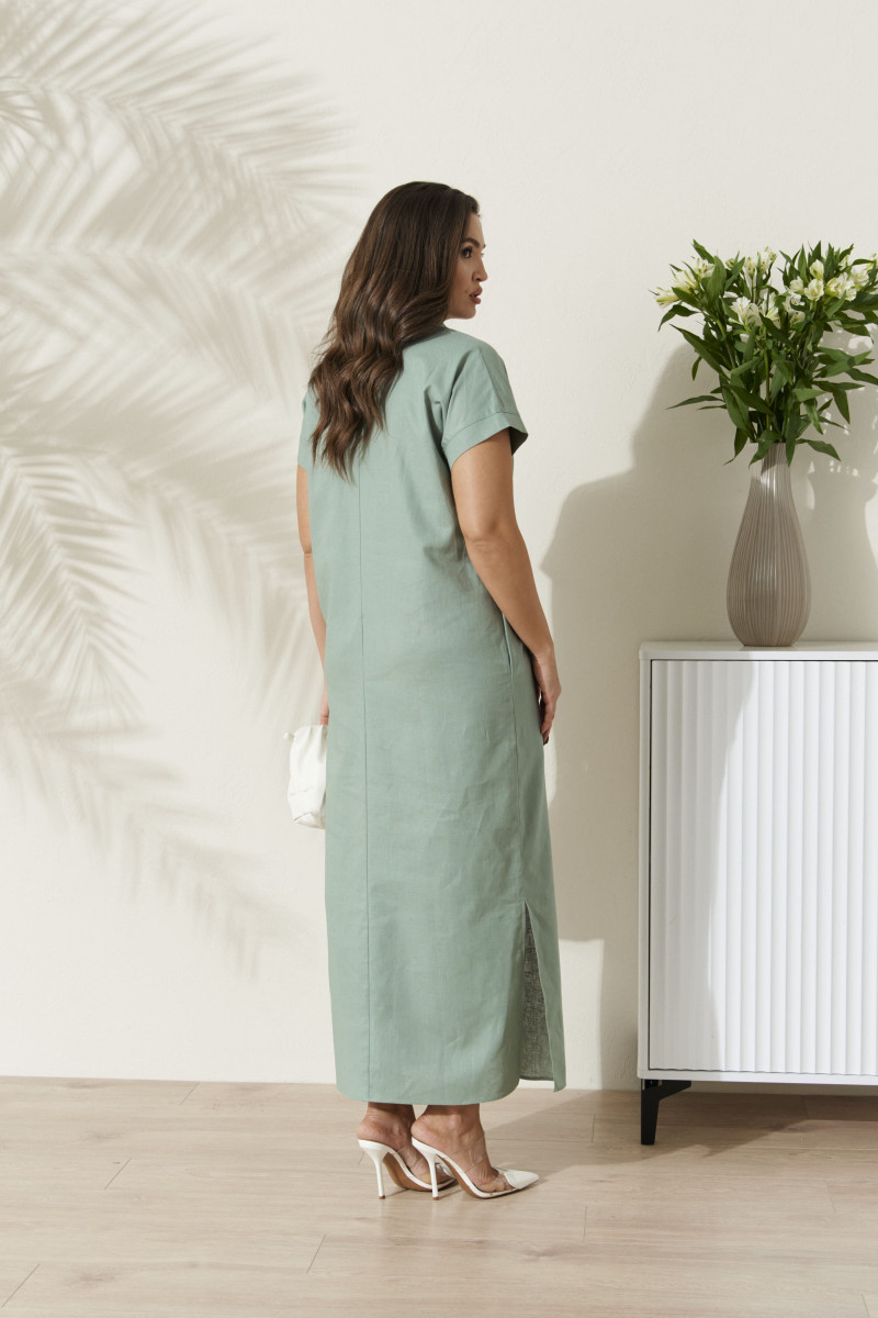 Платье женское из льняной ткани для повседневной носки. Платье прямое с прорезными карманами в боковых швах. Имеются разрезы по боковым швам. На передней части изделия дизайнерский элемент.
