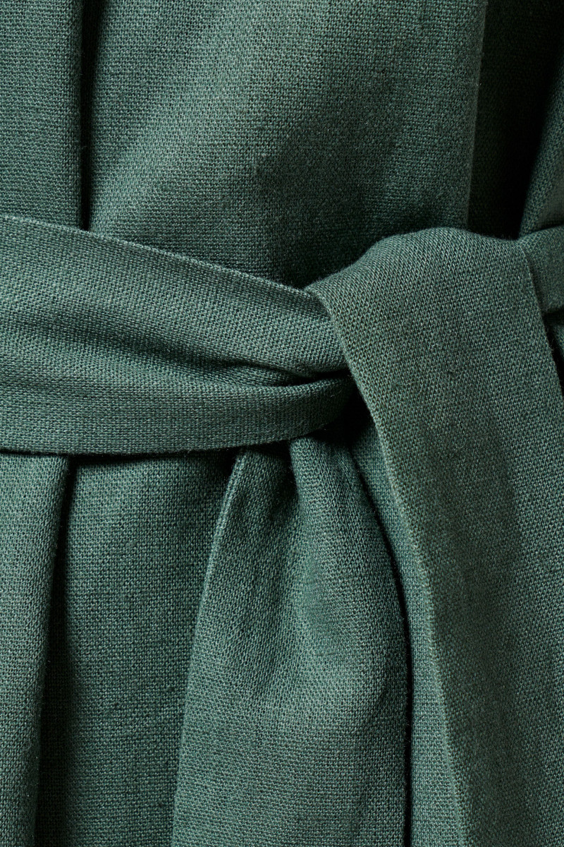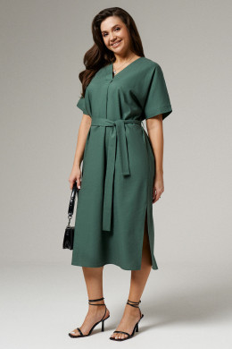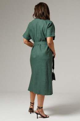 Платье из льняной ткани для повседневной носки. Силуэт платья прямой, рукав короткий цельнокроеный оформлен отложной манжетой. Горловина платья V-образная. В боковых швах разрезы от низа изделия. Платье укомплектовано поясом из основной ткани изделия.