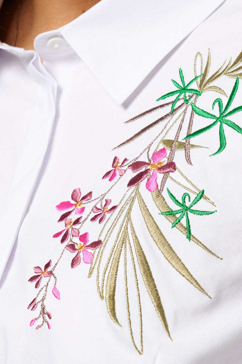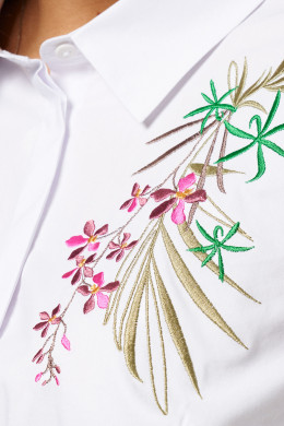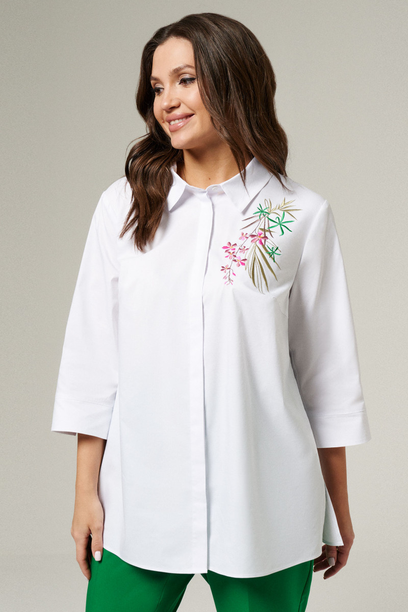 Блузка выполнена из хлопковой ткани в полуприлегающем силуэте и украшена изящной вышивкой в виде листиков с цветочками в голубых оттенках, что придает ей нежность и очарование. Горловина оформлена рубашечным воротником с отрезной стойкой, а укороченный рукав завершен притачной манжетой. По спинке расположена отрезная кокетка, которая подчеркивает силуэт и обеспечивает хорошую посадку. Модель выполнена в бело-розовых тонах, что добавляет ей свежести и женственности.