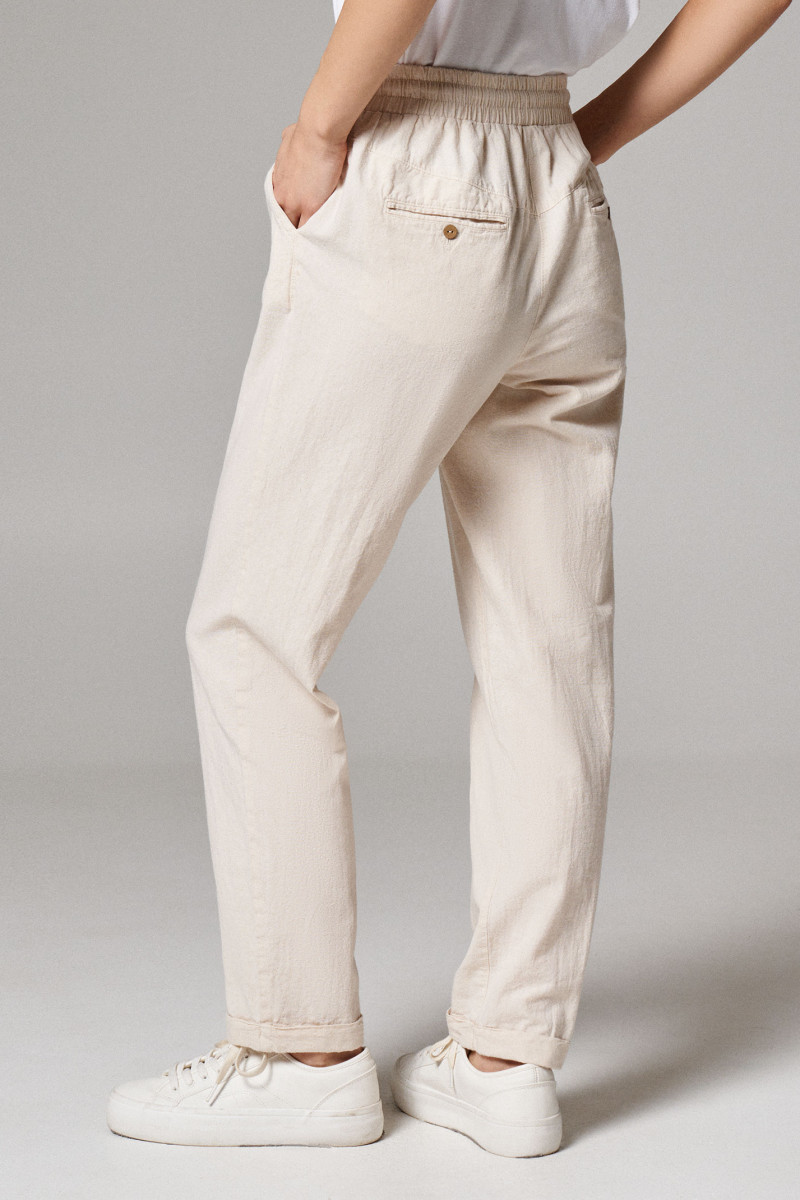 Брюки, слегка укороченные зауженные книзу брюки из хлопковой ткани. По переду по бокам имеются карманы на задних частях брюк имитация карманов в рамку. Пояс на резинке, в который протянут шнурок из основной ткани. По низу отложная манжета. Такие брюки отлично сочетаются с различными майками и джемперами. Беспроигрышный вариант в жару в гардеробе каждой женщины.