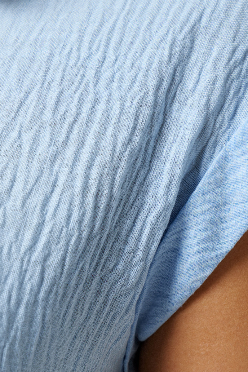 Лаконичная базовая блузка из тонкой хлопковой струящейся ткани. Блузка прямого силуэта с круглым вырезом горловины. Горловина обработана внутренней окантовкой. Проймы блузки обработаны декоративными отложными манжетами-крылышками. Такая универсальная базовая блузка станет неотъемлемым дополнением вашего летнего гардероба.