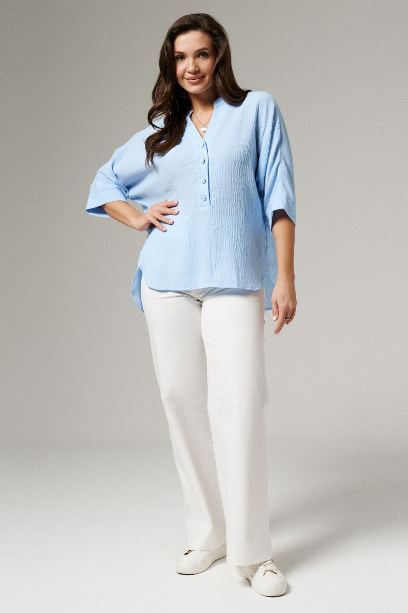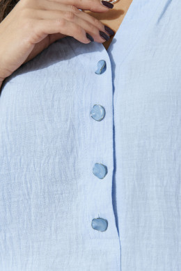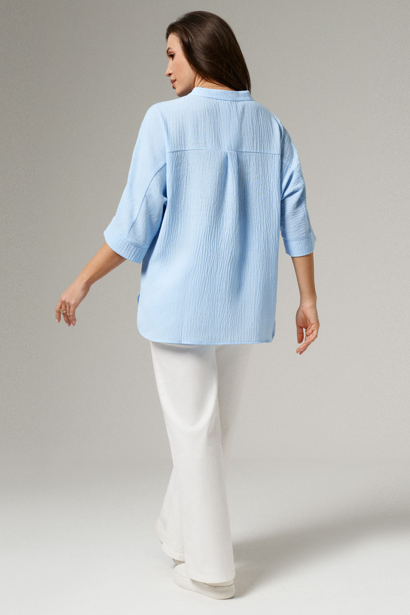 Оригинальная женская блузка из лёгкой хлопковой ткани, прямого силуэта, со спущенной линией плеча, горловина оформлена стойкой, центральная застежка до линии груди на четыре декоративные пуговицы, боковые швы книзу смещены на деталь переда, линия низа фигурной формы. Рукава 3/4, цельнокроеные, с отрезной манжетой. Спинка с кокеткой и складками от нее. Хороший вариант для работы и отдыха.