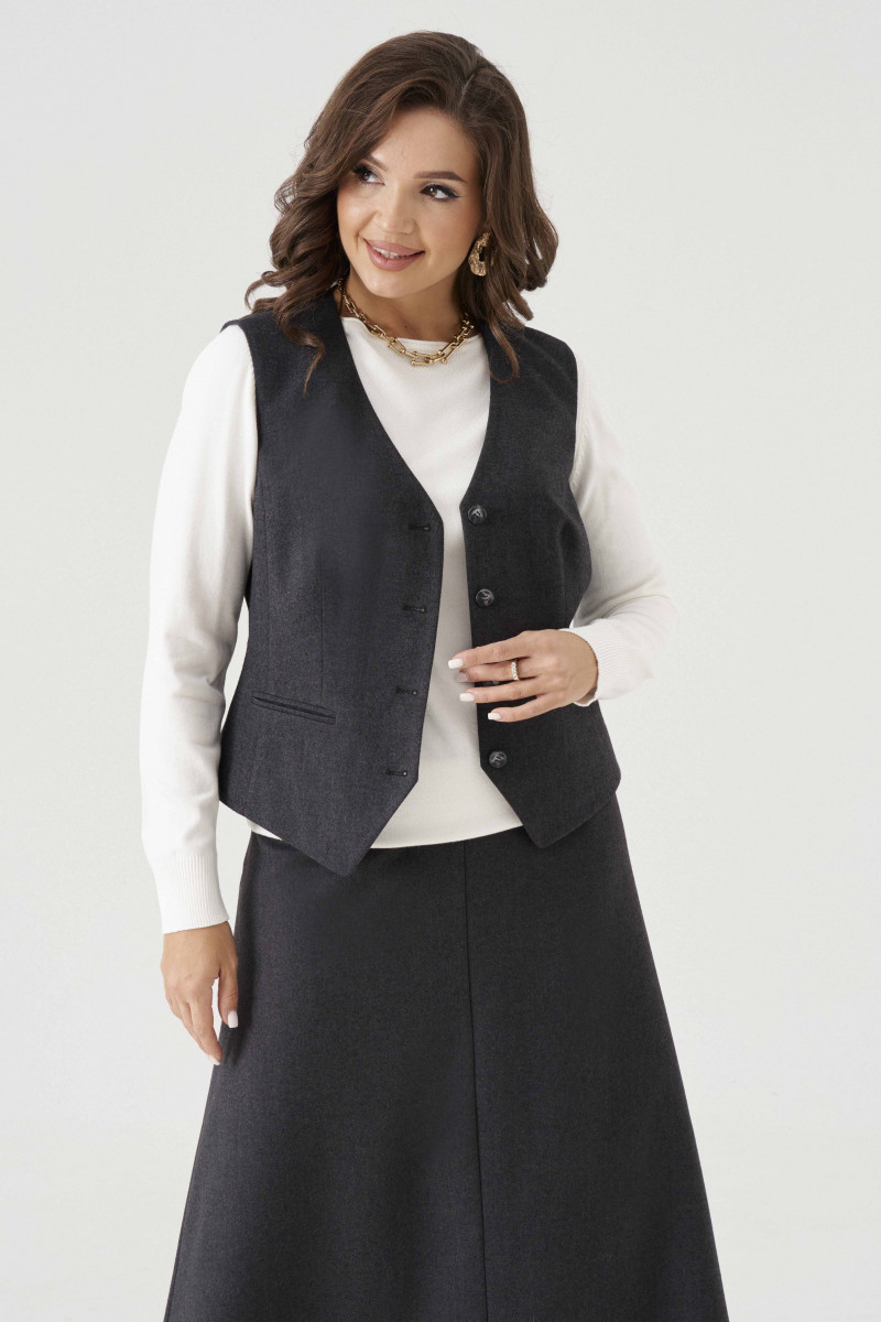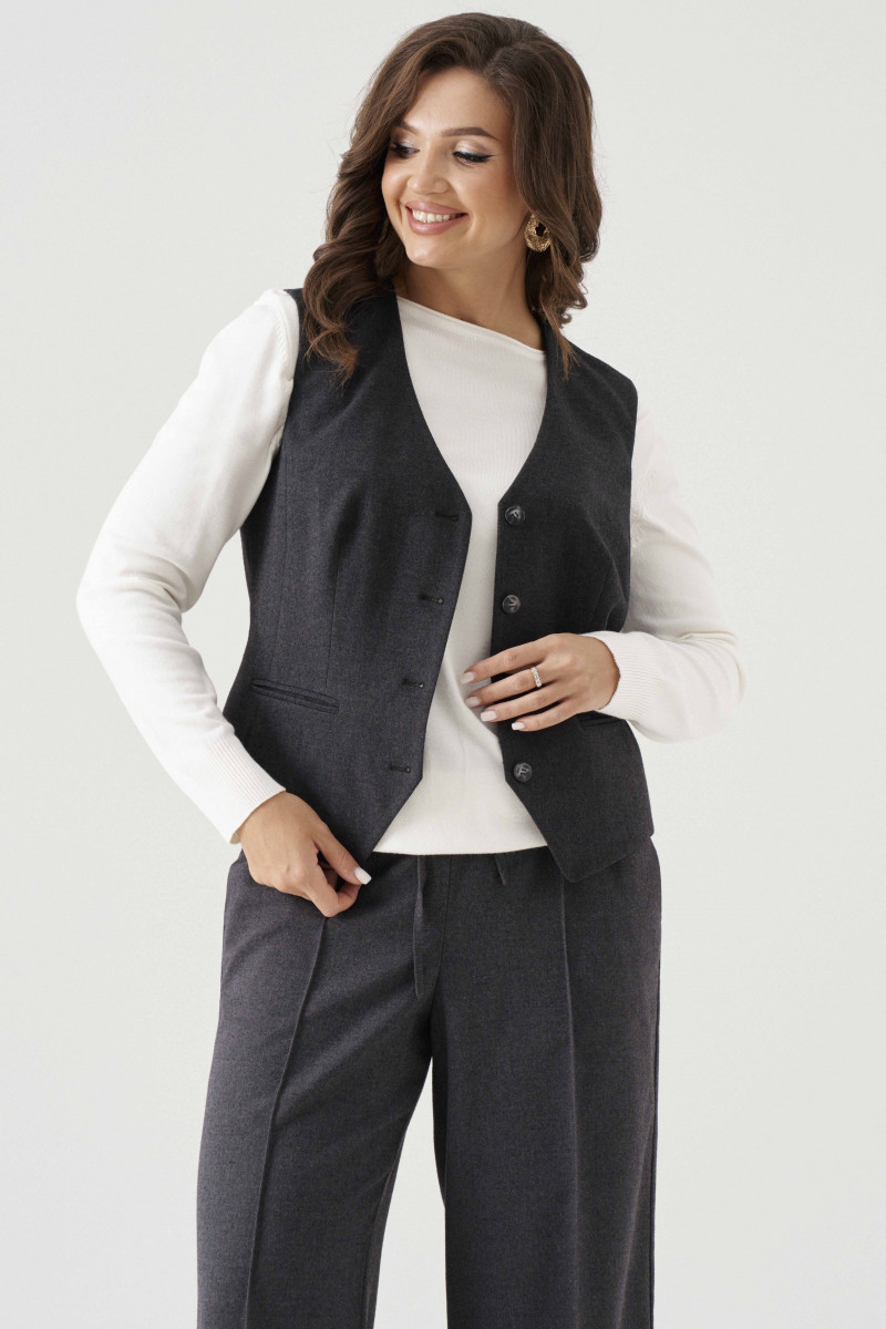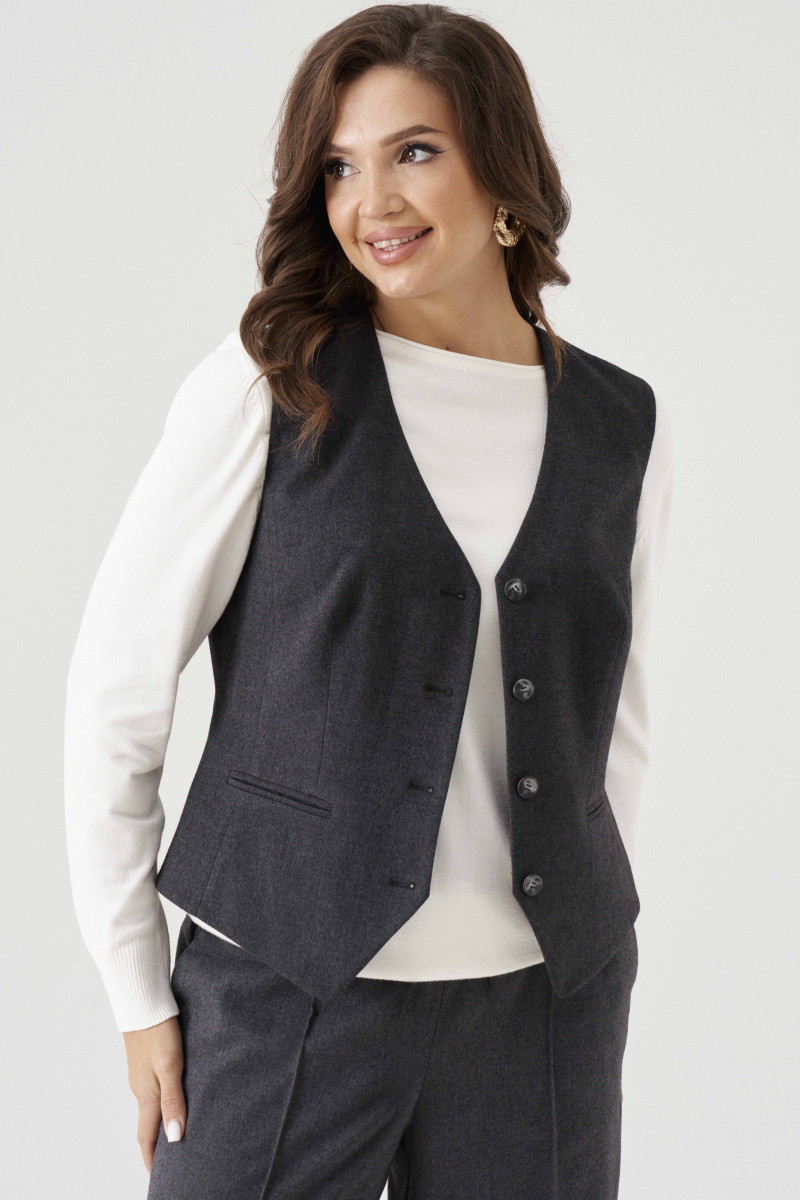 Жилет женский из смесовой ткани для повседневной носки полуприлегающего силуэта. Жилет без рукавов. Жилет имеет центральную бортовую застежку на четыре петли и четыре пуговицы. По переду имеются вертикальные рельефы, идущие от проймы до низа изделия, а также располагается талиевая вытачка с прорезным карманом в рамку с двумя обтачками. Спинка имеет вертикальные рельефы, идущие от проймы до низа изделия, а также имеются плечевые вытачки. Длина изделия классическая. Интересный вариант жилета, который подойдет под любой ваш гардероб и на любое мероприятие. Жилет на подкладке.