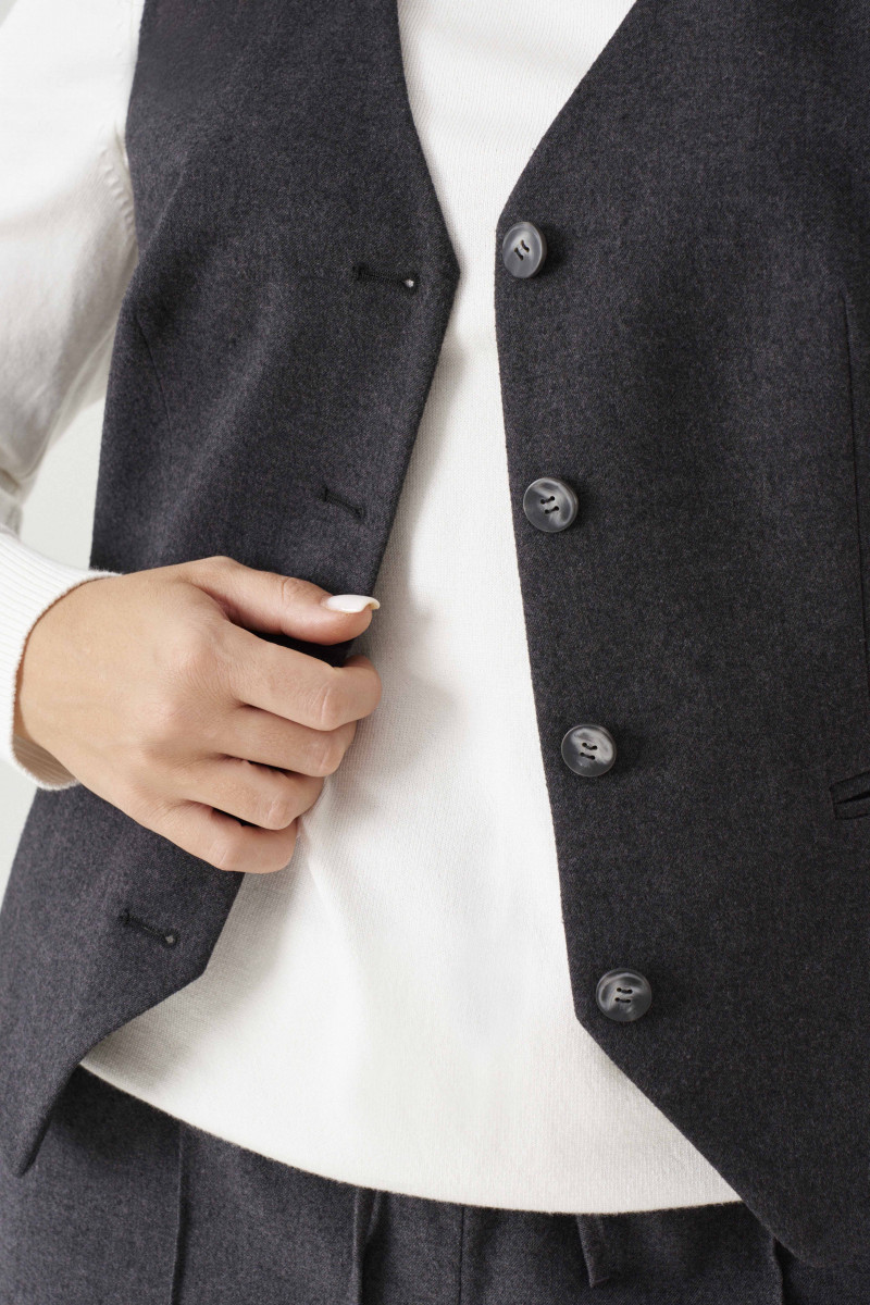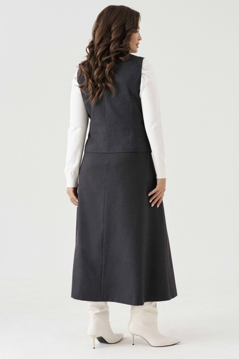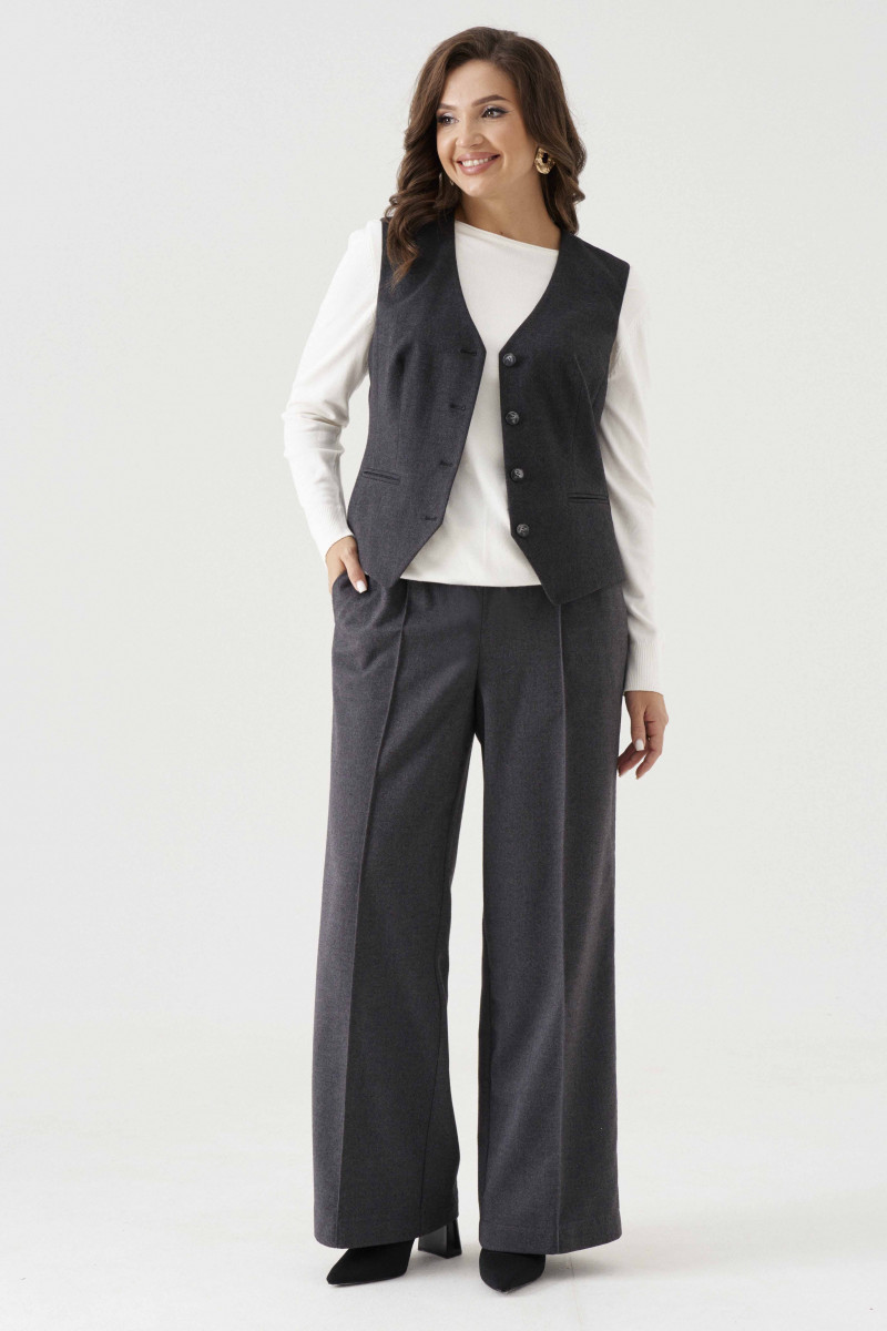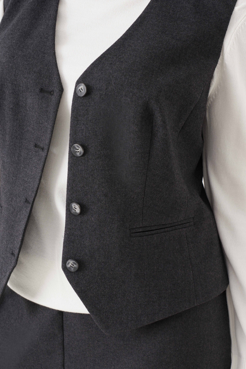 Жилет женский из смесовой ткани для повседневной носки полуприлегающего силуэта. Жилет без рукавов. Жилет имеет центральную бортовую застежку на четыре петли и четыре пуговицы. По переду имеются вертикальные рельефы, идущие от проймы до низа изделия, а также располагается талиевая вытачка с прорезным карманом в рамку с двумя обтачками. Спинка имеет вертикальные рельефы, идущие от проймы до низа изделия, а также имеются плечевые вытачки. Длина изделия классическая. Интересный вариант жилета, который подойдет под любой ваш гардероб и на любое мероприятие. Жилет на подкладке.