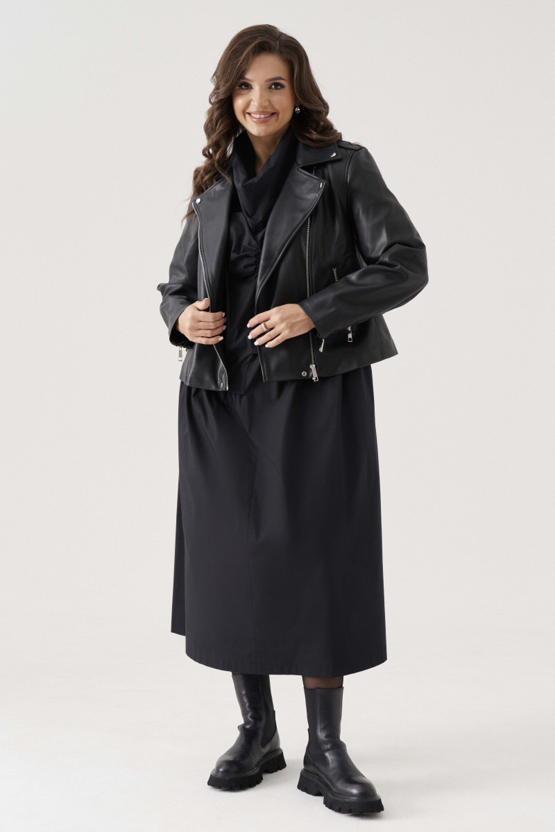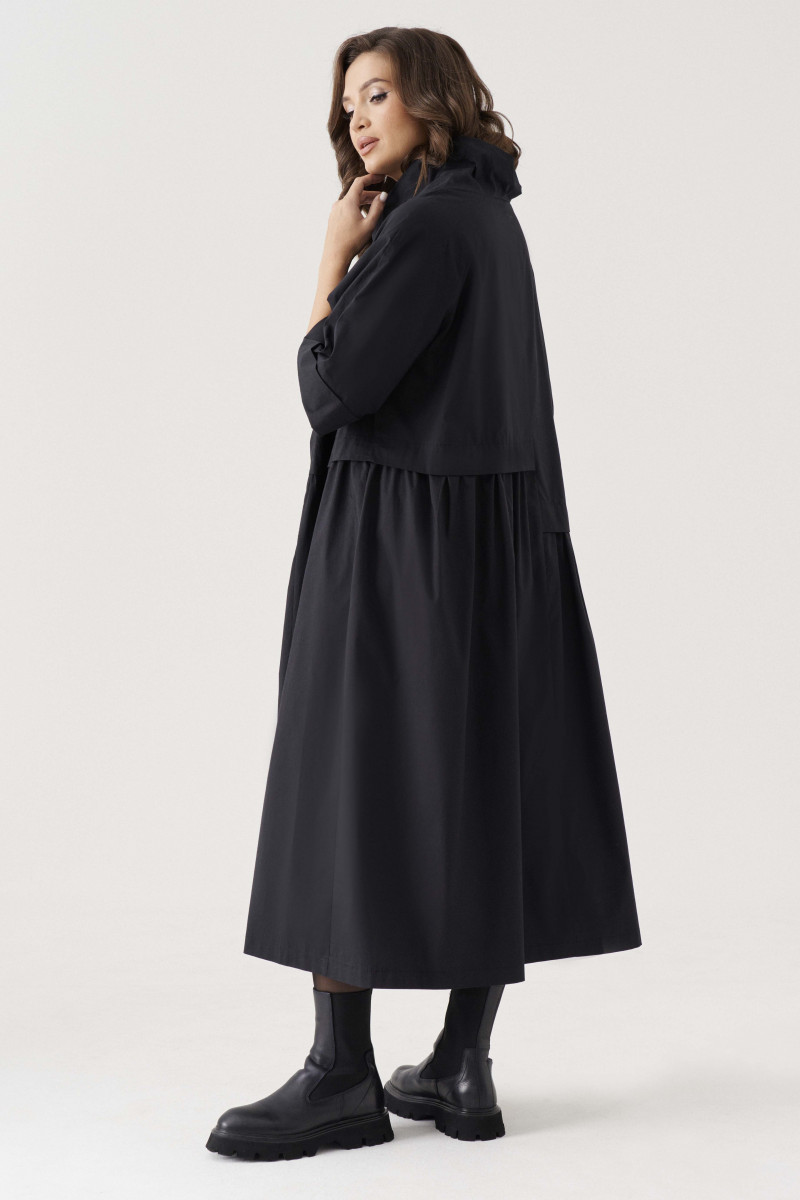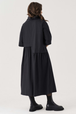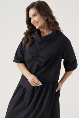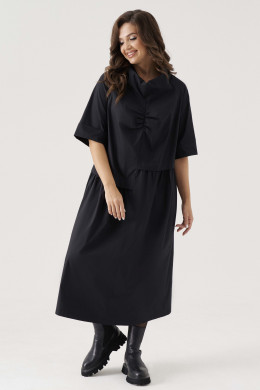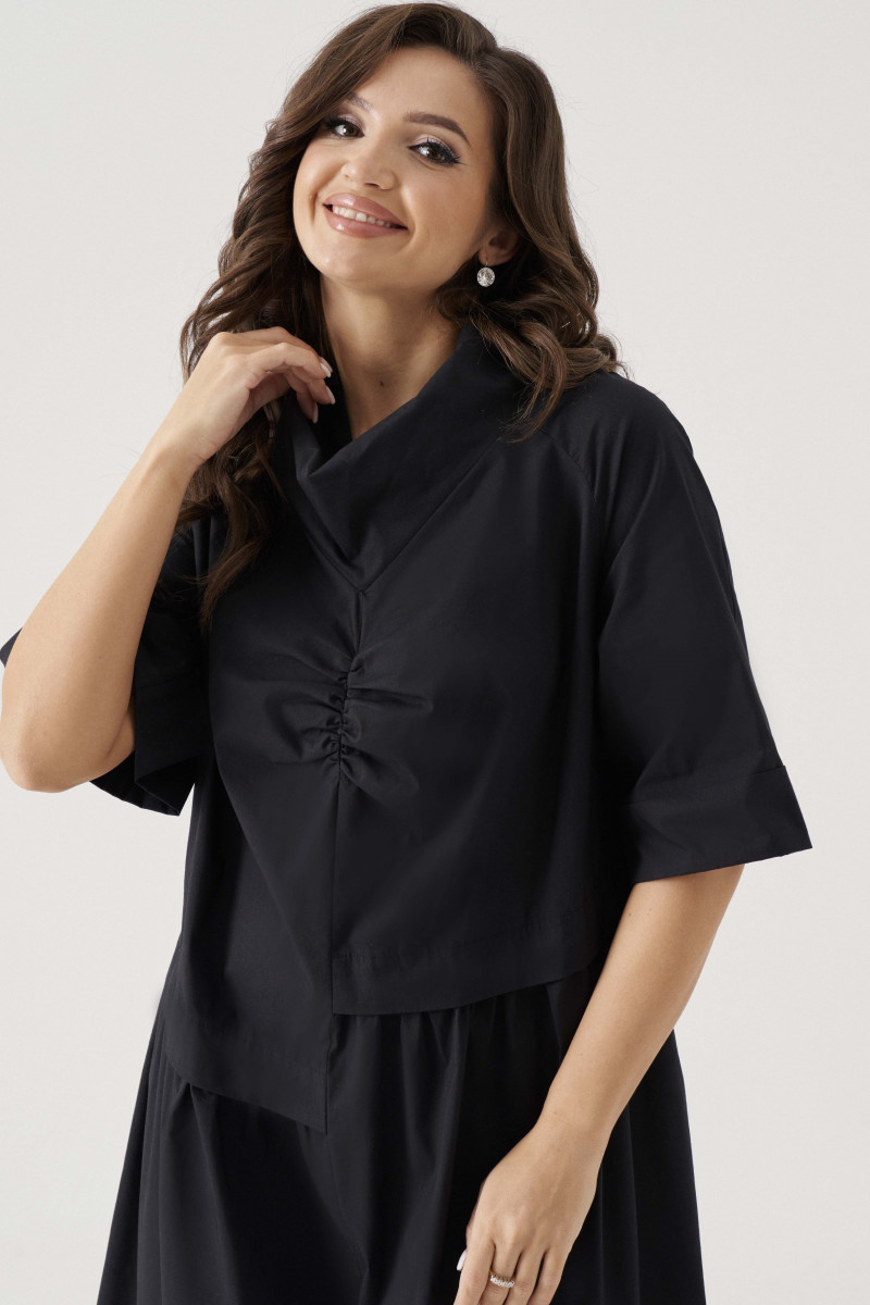 Платье женское из хлопковой ткани для повседневной носки прямого силуэта. Платье отрезное, расширенное к низу. По переду имеется ассиметричная отрезана часть лифа, стянутая в небольшие складки вдоль груди, а также имеется сборка. Спинка имеет неравномерную отрезную часть лифа и средний шов, а также сборку. Горловина обработана объемным воротником. Рукава реглан с заворотами по низу рукава. Длина платья миди. Очень интересное и модное платье которое не оставит никого равнодушным.