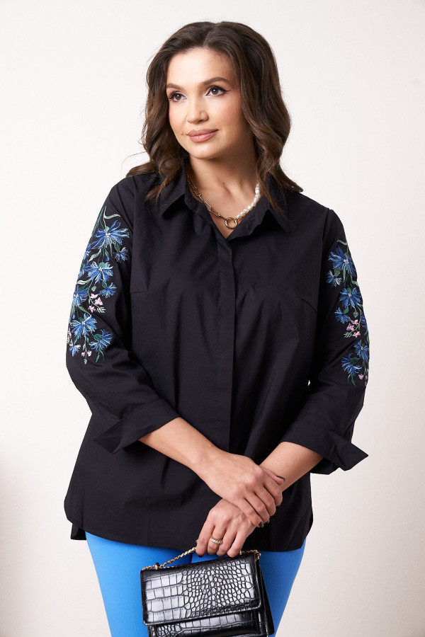 Блузка женская из хлопковой ткани для повседневной носки полуприлегающего силуэта. Застежка в блузке на восемь обметанных петель и восемь пуговиц. Перед имеет вертикальные рельефы, идущие от линии плеча до линии низа, а также на переде располагается боковой прорезной карман в шве. Изделие отрезное по боковой и задней части низа. Спинка имеет два вертикальных рельефа, идущих от линии плеча до отрезной части низа. А также на центральной части спинки дизайнерская печать в виде цветка. По переду и по низу печать в виде букв. Горловина обработана рубашечным воротником. Рукава втачные, низ рукава обработан притачной манжетой с застежкой на две обметанные петли и две пуговицы. Модная и интересная блузка.