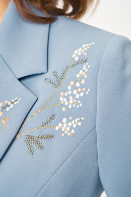Комплект женский из костюмной ткани для повседневной носки. В комплект входят жакет и юбка. Жакет полуприлегающего силуэта. Жакет однобортный с отложным воротником классической длины. По переду прорезные карманы. Перед и лацкан украшен дизайнерской вышивкой. Жакет на подкладке. Юбка классическая на поясе-обтачке прямого силуэта. По заднему полотнищу юбки есть талиевые вытачки. Средний шов переходит в шлицу. Застёжка на потайную молнию и пуговицу на поясе-обтачке. Юбка на подкладке. Длина юбка классическая.
