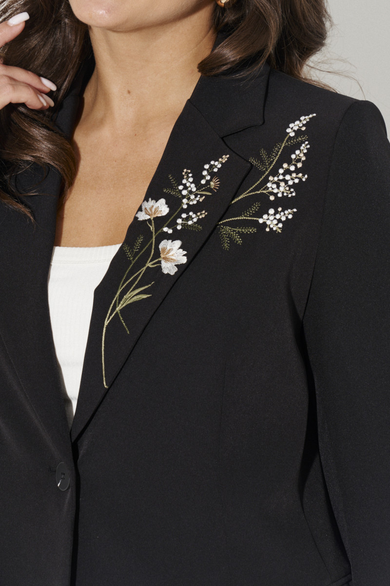 Костюм женский из костюмной ткани для повседневной носки. Костюм состоит из жакета и брюк. Жакет полуприлегающего силуэта, однобортный с отложным воротником. По переду прорезные карманы с клапаном и двумя обтачками. Перед и лацкан жакета украшены дизайнерской вышивкой. Жакет классической длины. Брюки прямого силуэта. Пояс отрезной. В боковые части пояса вставлена резинка. Застежка на одну обметанную петлю и одну пуговицу, а также в среднем шве брюк имеется застежка на тесьму-молнию. Длина брюк классическая. Очень элегантный и стильный костюм, который будет отлично смотреться на любой фигуре.