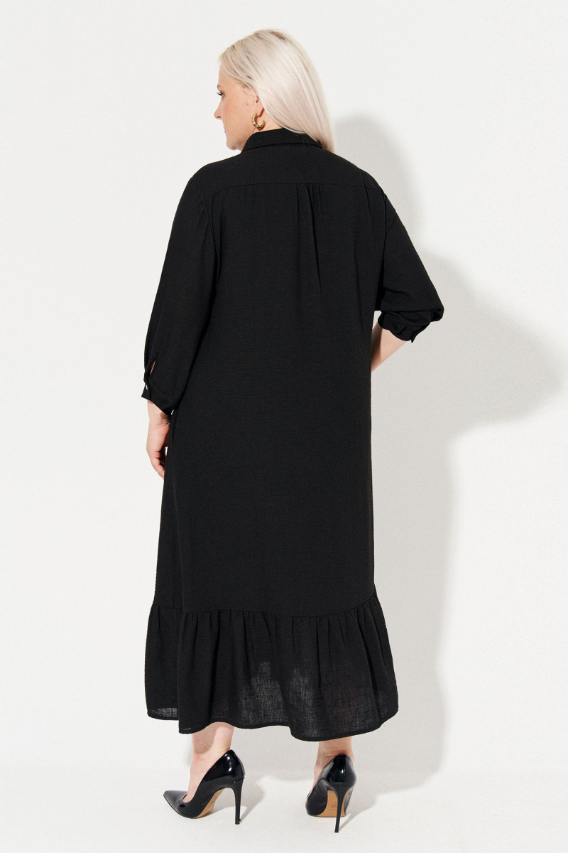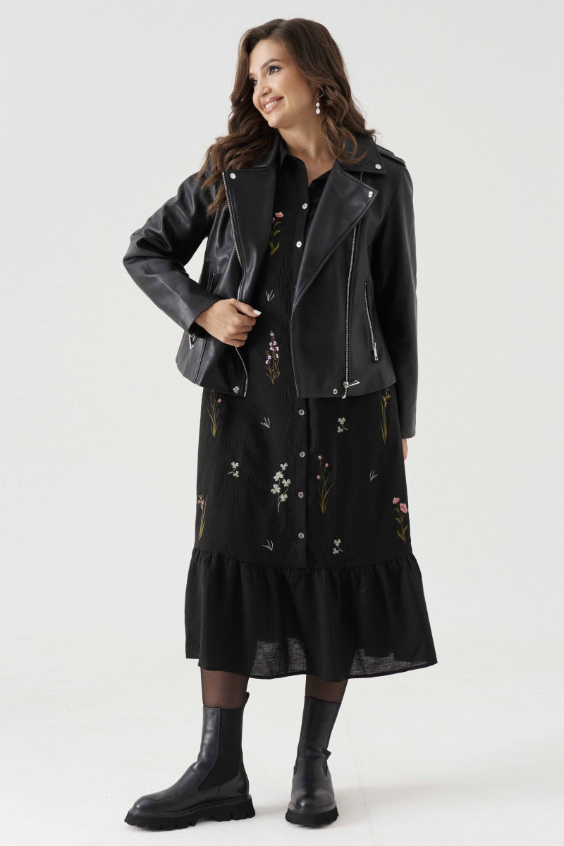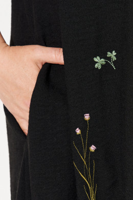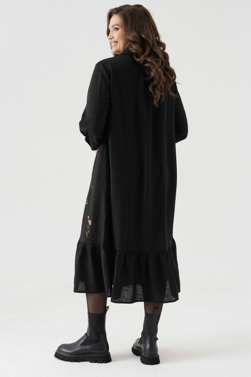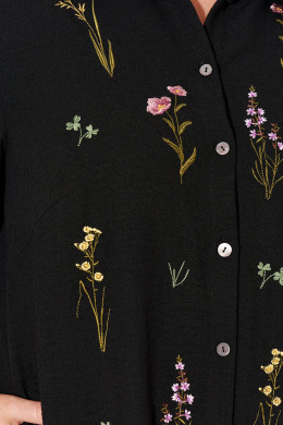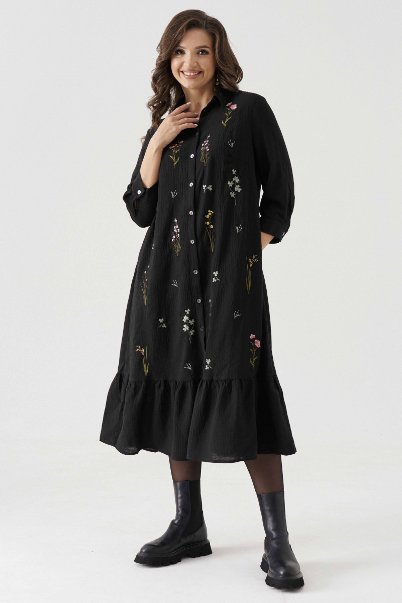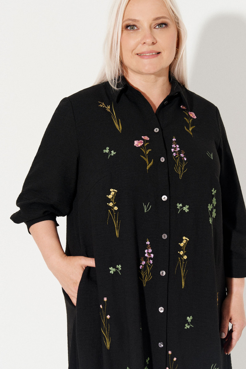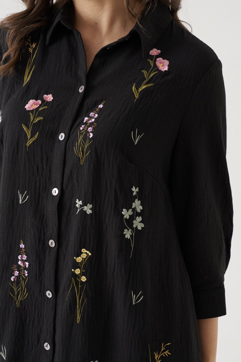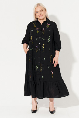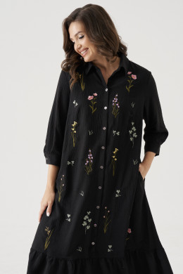 Платье женское из лёгкой ткани для повседневной носки. Платье расширенного силуэта. Горловина оформлена воротником стойкой. Рукав 3/4, низ рукава оформлен манжетой, застёгивающаяся на петлю-пуговицу. На передней части изделия дизайнерская вышивка с цветочным мотивом. Спинка с отрезной кокеткой, по шву сборка. Изделие с фронтальной застежкой на петли- пуговицы. По низу платья отрезной ярус на сборке. Платье на вискозной подкладке.