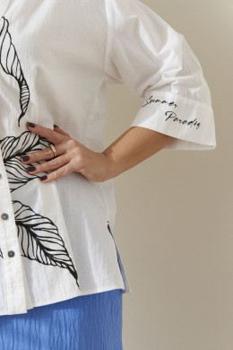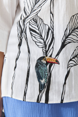 Блузка женская из хлопчатобумажной ткани для повседневной носки прямого силуэта. Блузка с центральной бортовой застежкой на обметанные петли и пуговицы. Перед имеет дизайнерский декор: печать в виде листьев и вышивку туканa на ветке. Спинка имеет кокетку с двумя складками и дизайнерскую печать в виде надписи. В боковых швах имеются небольшие разрезы. Горловина обработана втачной планкой с V-образной горловиной, а также со стойкой. Рукава втачные, длина рукава чуть ниже локтя, на манжете рукава имеется дизайнерская печать в виде надписи. Очень красивая блузка, в которой вы будете чувствовать себя комфортно и очень стильно.