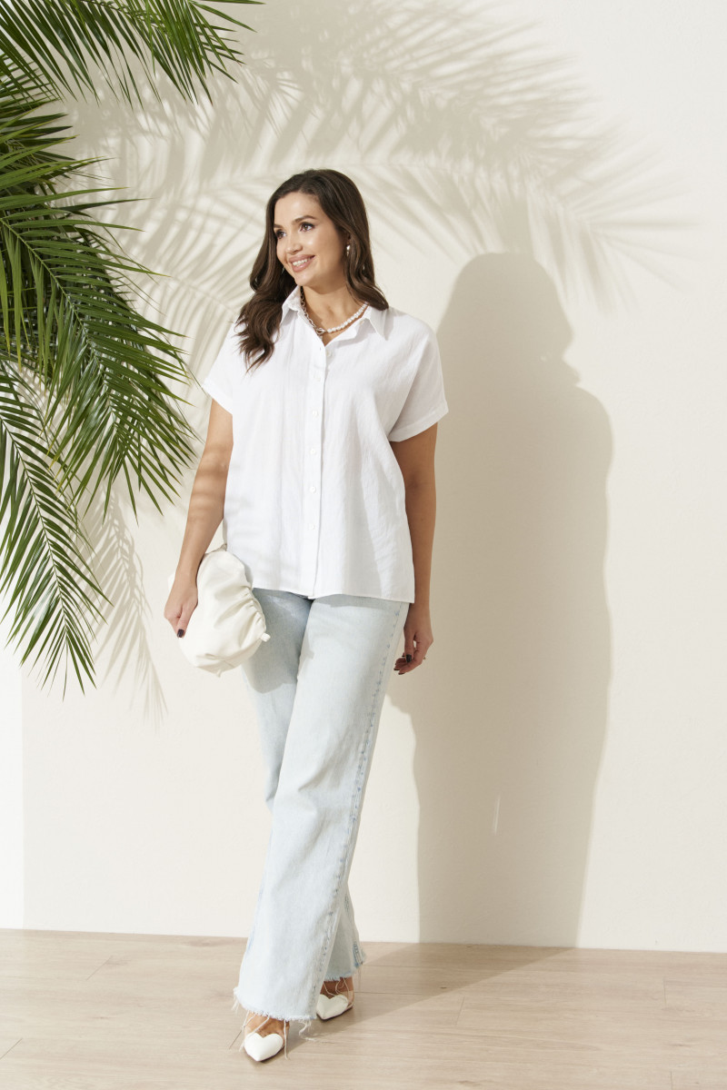 Блузка женская из хлопчатобумажной ткани прямого силуэта для повседневной носки. В блузке имеется центральная бортовая застежка на шесть обметанных петель и шесть пуговиц. В боковых швах имеются небольшие разрезы. Горловина обработана рубашечным воротником с отрезной стойкой. Блузка с цельнокроеным коротким рукавом. Очень легкая и воздушная блузка подарит вашему телу комфорт, а также будет отлично смотреться на вашей фигуре.