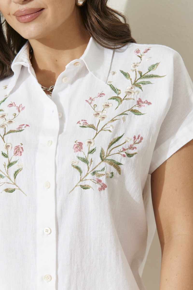 Блузка женская из хлопчатобумажной ткани прямого силуэта для повседневной носки. В блузке имеется центральная бортовая застежка на шесть обметанных петель и шесть пуговиц. В боковых швах имеются небольшие разрезы. Горловина обработана рубашечным воротником с отрезной стойкой. Блузка с цельнокроеным коротким рукавом. Очень легкая и воздушная блузка подарит вашему телу комфорт, а также будет отлично смотреться на вашей фигуре.