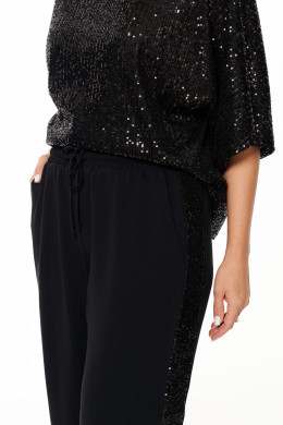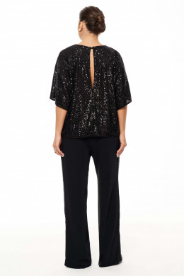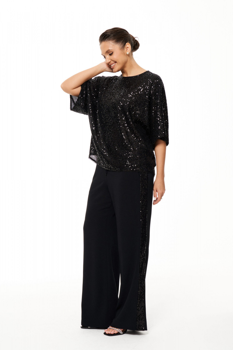 | 56 | Блузка: Длина изделия - 63см, Ширина плеча - 45см, Ширина по груди - 67см, Ширина по низу - 67см, Ширина рукава под проймой - 32см; Брюки: Высота посадки - 32см, Длина брюк с поясом - 109см, Длина по внутреннему шву - 81см, Ширина брючин сверху - 78см, Обхват брюк по низу - 60см, Ширина по бедрам - 68см, Ширина по талии - 86см; |