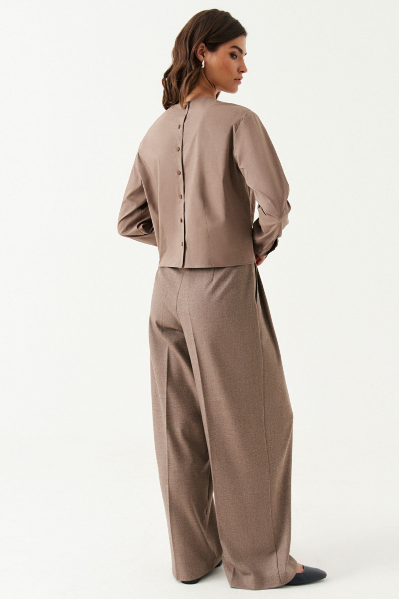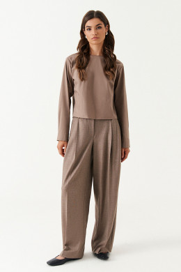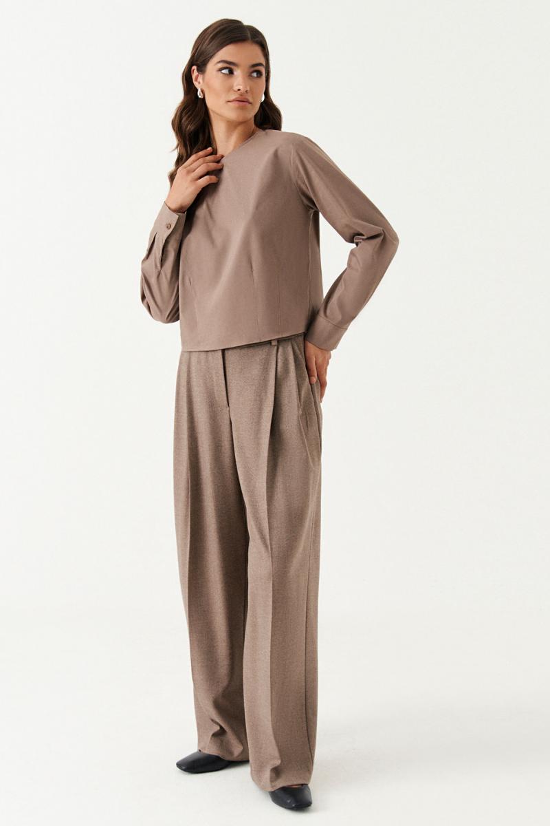 Брюки женские прямые из смесовой ткани для повседневной носки. Верхний срез брюк обработан притачным поясом, застежка на один крючок, а также имеется застежка на тесьму-молнию в среднем шве брюк. В брюках имеются шлёвки, что позволяет носить их под ремень. Передняя часть брюк имеет две складки и заутюженную стрелку по центру брюк. Задняя часть брюк имеет две талиевые вытачки. Отличный классический вариант брюк, которые будут гармонично смотреться под любые изделия.