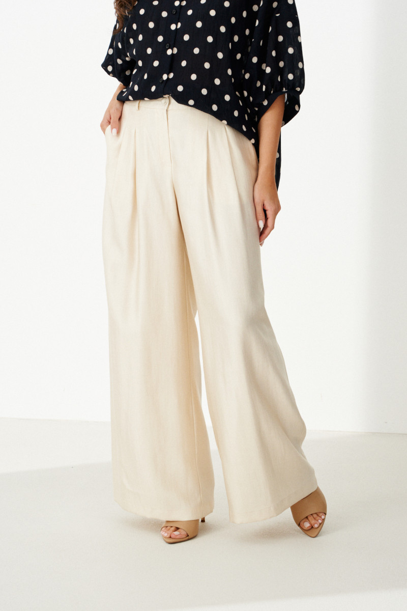 Данные женские брюки выполнены из вискозной ткани с приятным блеском, что обеспечивает приятное ощущение и комфорт при носке. Верхний срез брюк оформлен притачным поясом, дополненным вставкой на резинке в задней и боковых частях, что позволяет добиться идеальной посадки и свободы движений. Передняя часть брюк украшена складками делая вашу фигуру более утончённой. В задней части брюк расположены две талиевые вытачки, придающие форму и подчёркивающие линию талии. Боковой шов с потайным карманом обеспечивает дополнительную практичность. Брюки прямые, создавая современный и стройный силуэт. Застежка выполнена на одну обметанную петлю и одну пуговицу, а также на застежку-молнию, расположенную в среднем шве, что обеспечивает удобство и надежность в использовании. Цвет брюк — голубой, нежный и легко сочетаемый с другими предметами гардероба, делая их подходящим вариантом для повседневных и деловых образов.