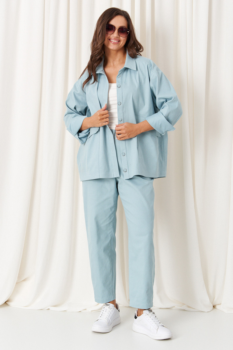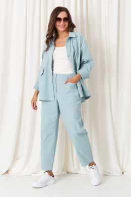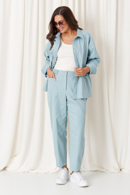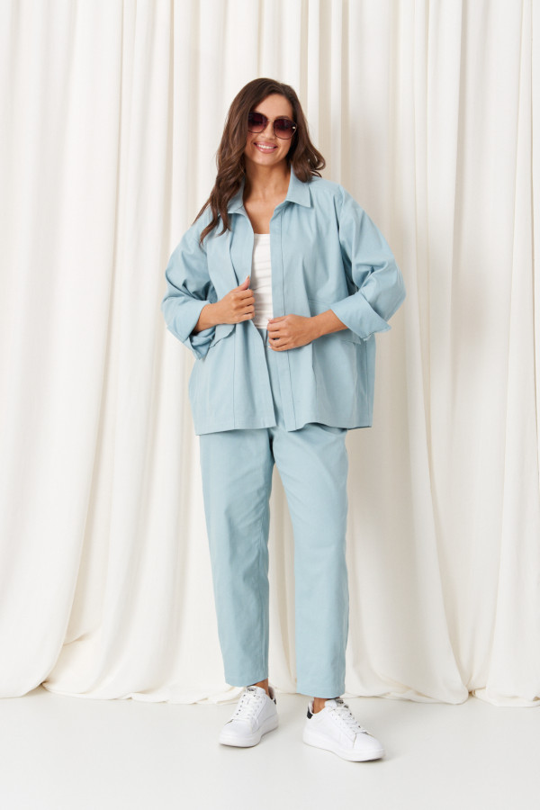 | 56 | Жакет: Длина изделия по спинке - 75,5см, Длина рукава - 55см, Ширина плеча - 20,2см, Ширина по груди - 72см, Ширина по низу - 77см, Ширина рукава вверху - 27см, Ширина рукава внизу - 15см; Брюки: Высота посадки - 29см, Длина брюк с поясом - 98см, Длина по шаговому шву - 67,6см, Ширина по бедрам - 63см, Ширина по низу - 20,5см, Ширина по талии - 47см; |