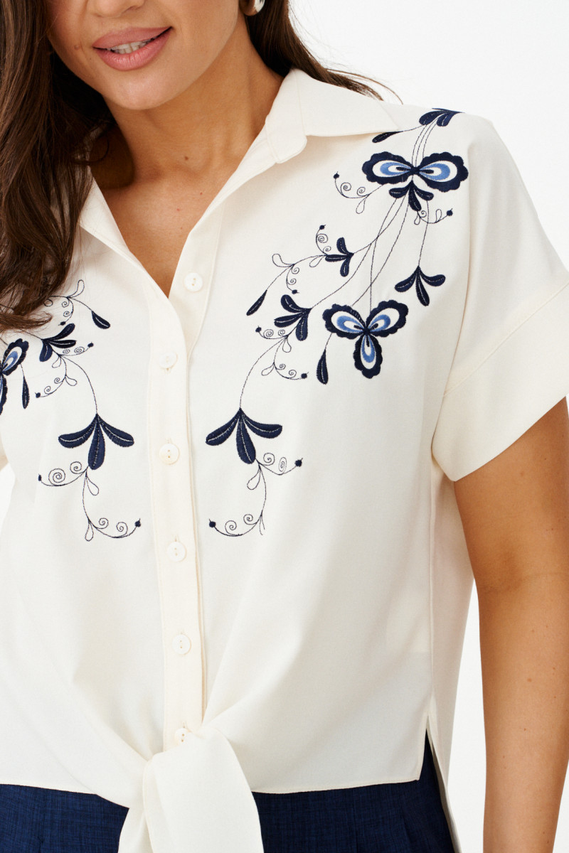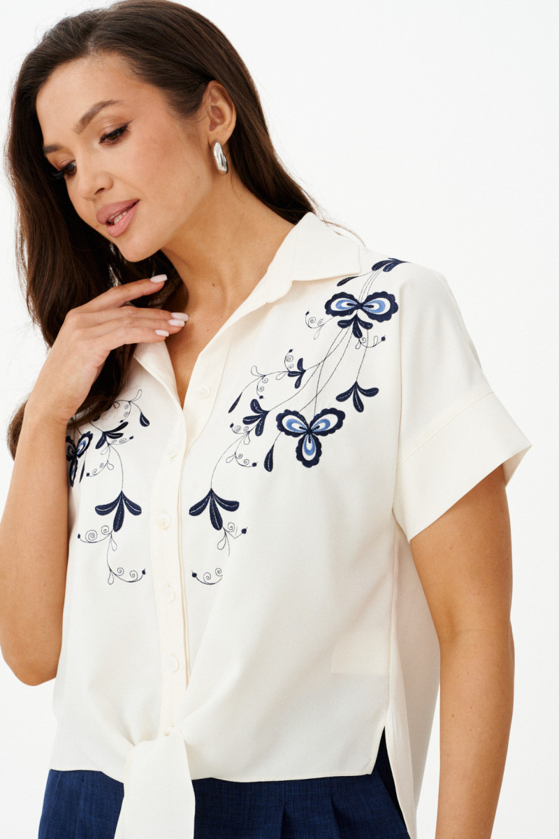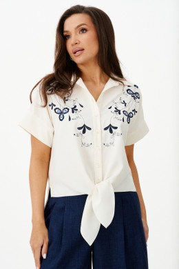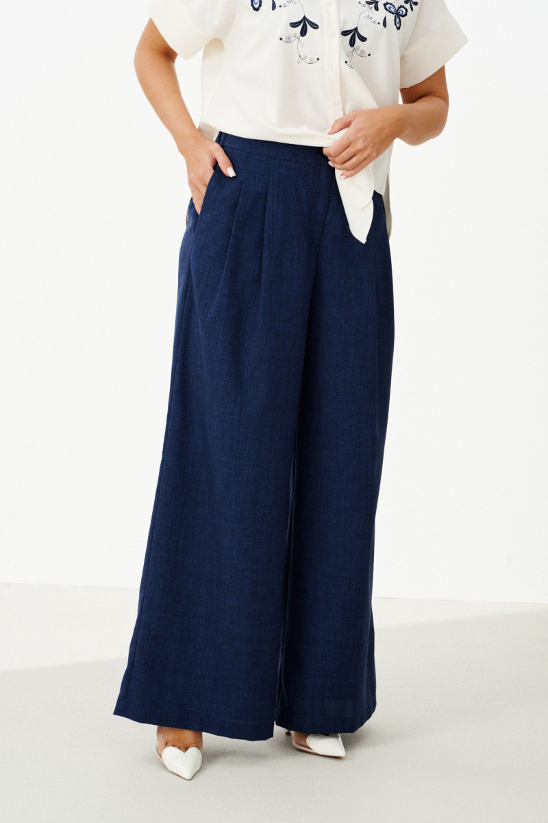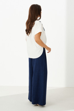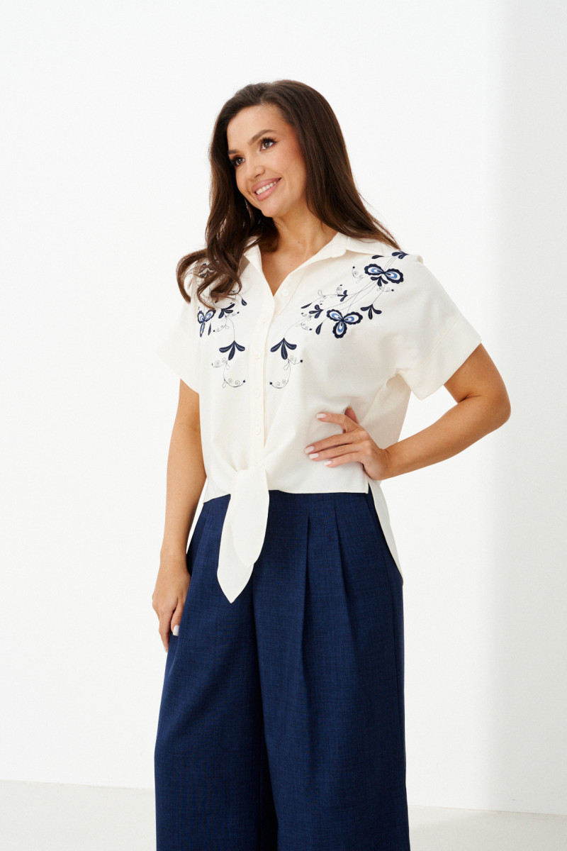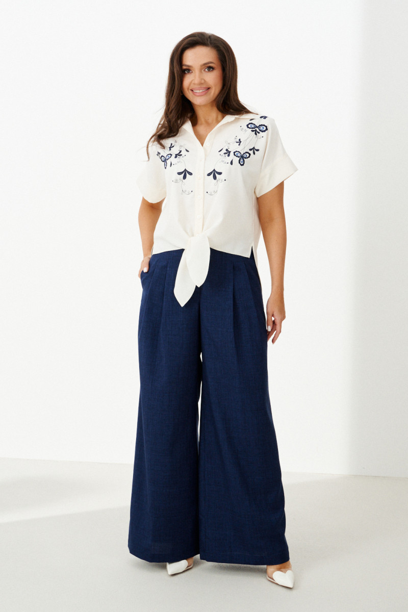 Комплект женский из смесовой ткани с добавлением льна для повседневной носки состоит из белой блузки и синих брюк, созданных в гармоничном бело-синем сочетании. Блузка выполнена в прямом силуэте с центральной бортовой застежкой на обметанные петли и пуговицы. Передняя часть украшена изысканной синей вышивкой, придающей изделию индивидуальность и элегантность, а также дополнена удлиненными завязками, которые завершают образ.
