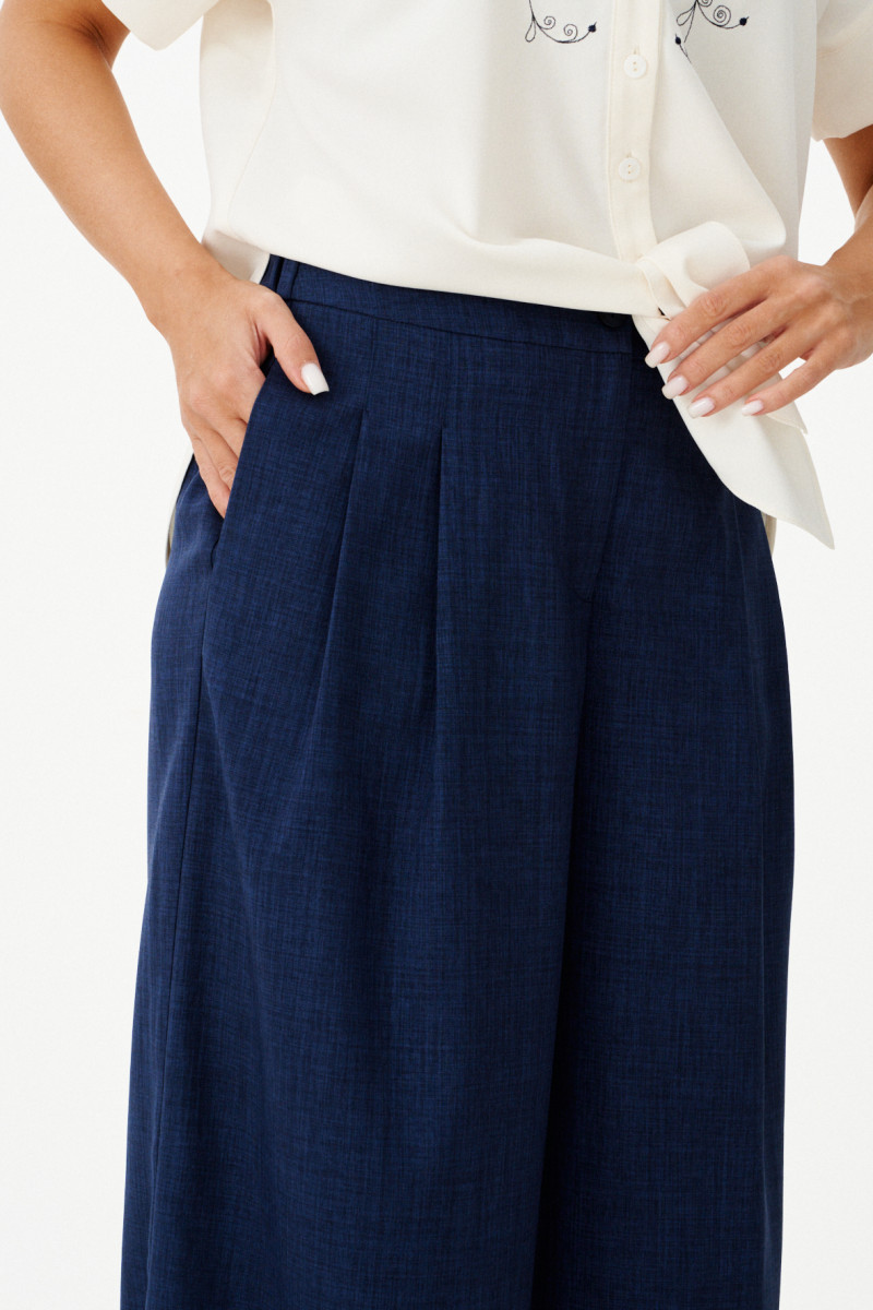 Спинка блузки имеет круглый низ. В боковых швах выполнены небольшие разрезы, добавляющие легкость и подвижность. Горловина обработана классическим рубашечным воротником на стойке, придающим образу утонченную строгость, а цельнокроеные рукава завершаются притачной манжетой, обеспечивающей аккуратную посадку и удобство. Брюки имеют прямой, свободный крой, идеально подходящий для повседневной носки. Верхний срез обработан притачным поясом с вставкой из эластичной резинки в задней части, обеспечивающей комфортную посадку и возможность регулировки по талии. Застежка выполнена комбинированной — на обметанную петлю и пуговицу с дополнительной потайной молнией в среднем шве для надежности и удобства. В пояс вставлены шлёвки, позволяющие использовать ремень по желанию. Передняя часть брюк украшена мягкими складками, придающими объем и динамику силуэту, а задняя часть дополнена двумя талиевыми вытачками для идеальной посадки. В боковом шве спрятан потайной карман, сочетающий функциональность с чистотой линий. Комплект выполнен из мягкой, износостойкой смесовой ткани, сочетающей натуральные волокна — он приятен к телу, легко стирается и сохраняет форму даже после многократной носки, делая его идеальным выбором для повседневного стиля, сочетающего комфорт, элегантность и практичность.