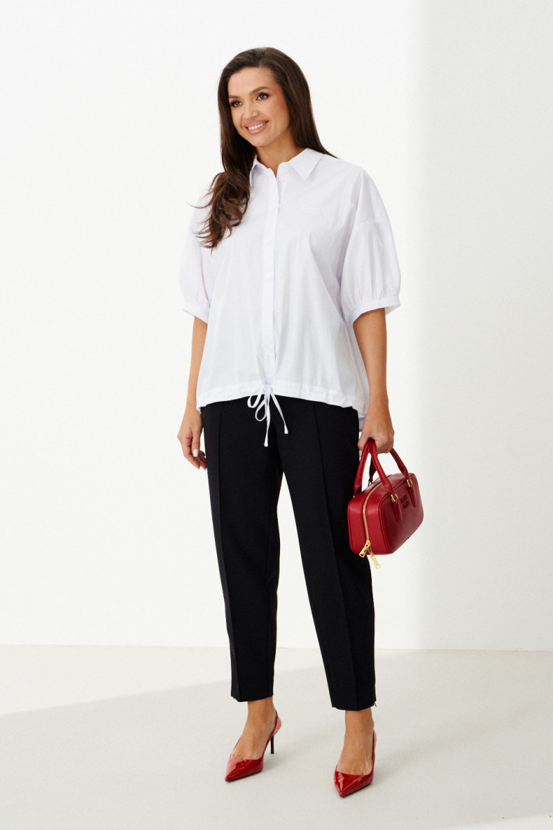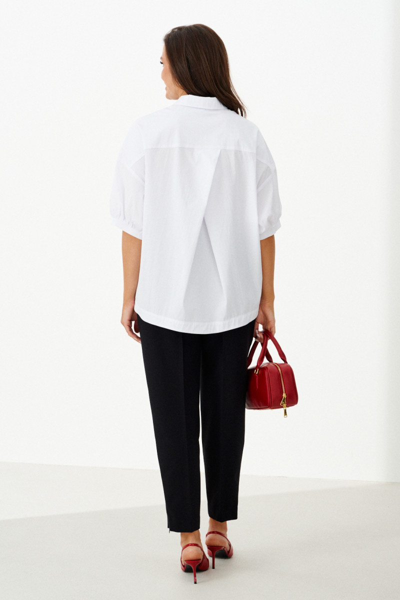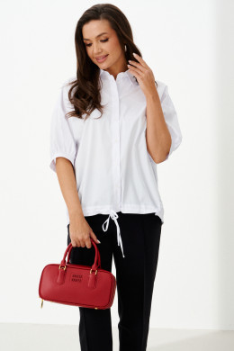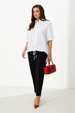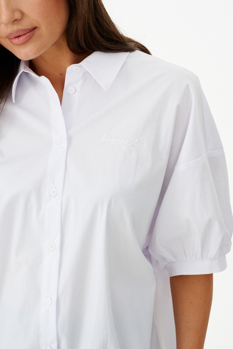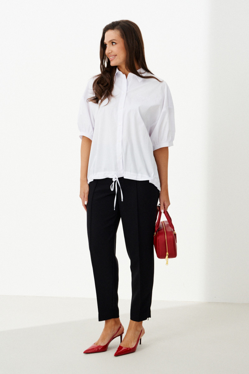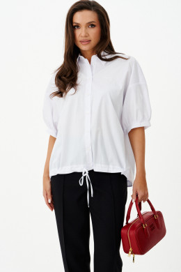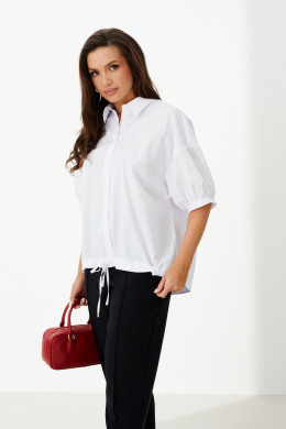 Женская блузка выполнена из смесовой ткани с высоким содержанием хлопка, что обеспечивает приятное ощущение мягкости и комфорта при носке. Модель имеет центральную бортовую застежку на аккуратные обметанные петли и пуговицы, придающую блузке классический и элегантный вид. Передняя часть украшена дизайнерской вышивкой в виде надписи, которая становится выразительной деталью и добавляет индивидуальности образу. Спинка модели дополнена кокеткой и складкой крест-накрест, что создает интересный силуэт и обеспечивает свободу движений. По низу изделия вставлена кулиса, позволяющая регулировать посадку и придающую блузке дополнительный стильный акцент. Горловина обработана рубашечным воротником, подчеркивающим универсальность и аккуратность модели. Линия плеча спущенная, что придает изделию легкую расслабленность и современный вид. Рукава втачные, длиной чуть ниже локтя, что делает блузку удобной и практичной. Нижняя часть рукавов оформлена притачной манжетой со сборкой, создающей легкий объем и завершающей изящный вид. Белый цвет блузки придает образу энергию и выразительность, делая её отличным элементом для создания стильных и запоминающихся комплектов.