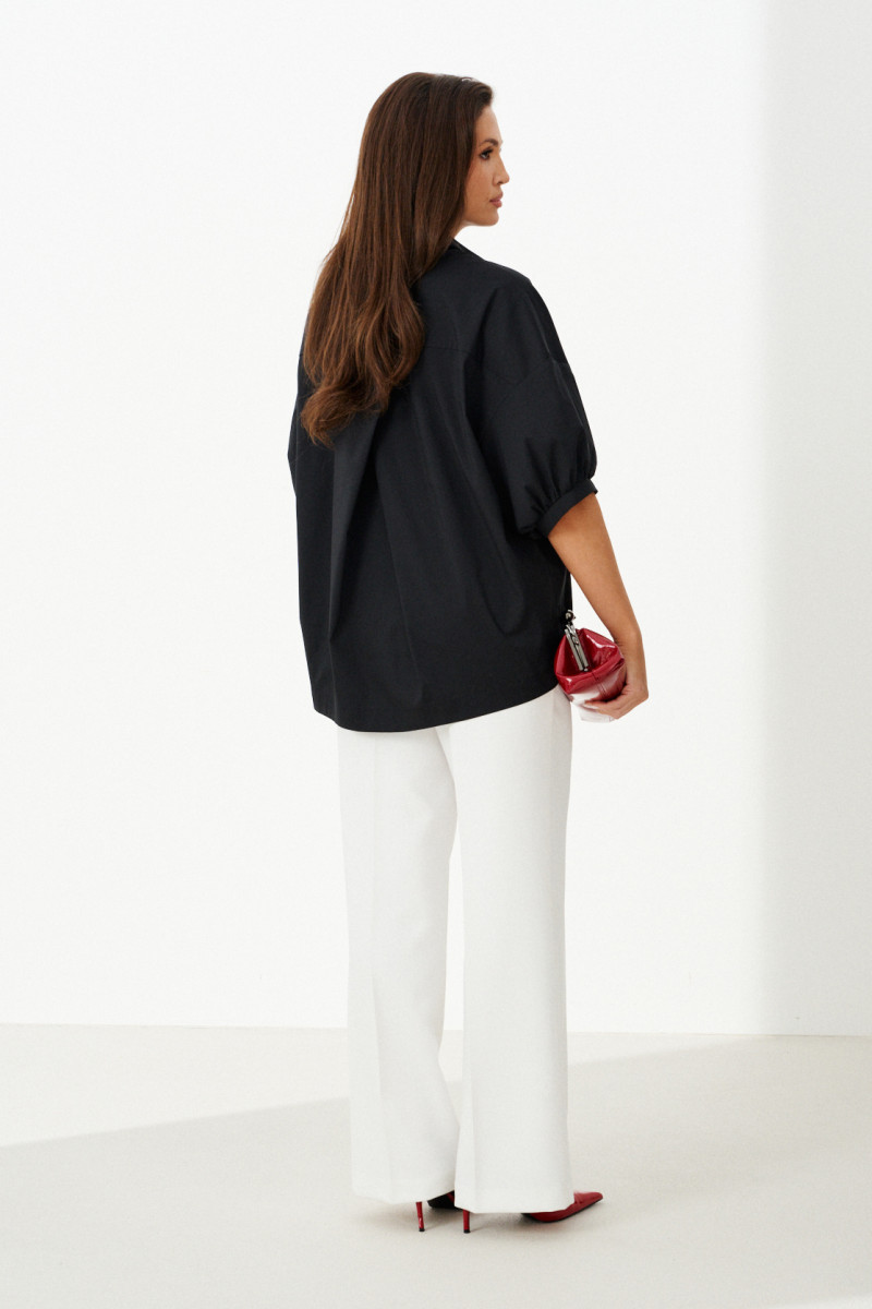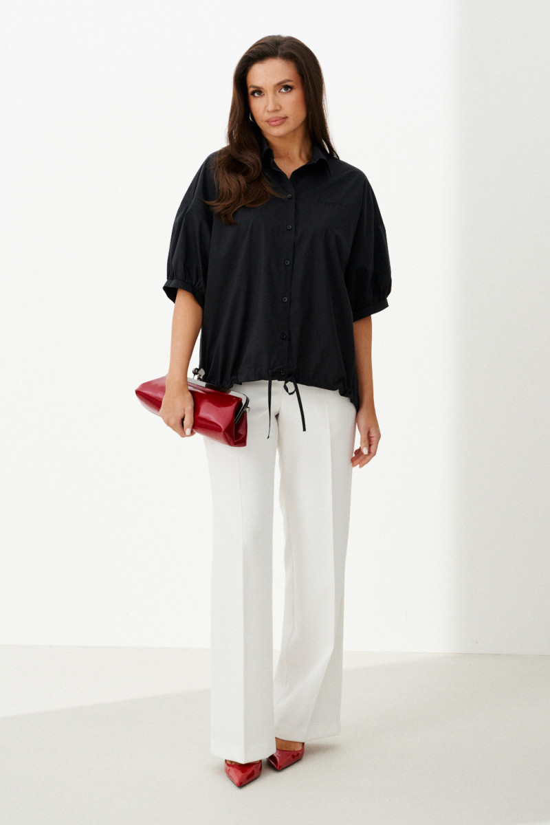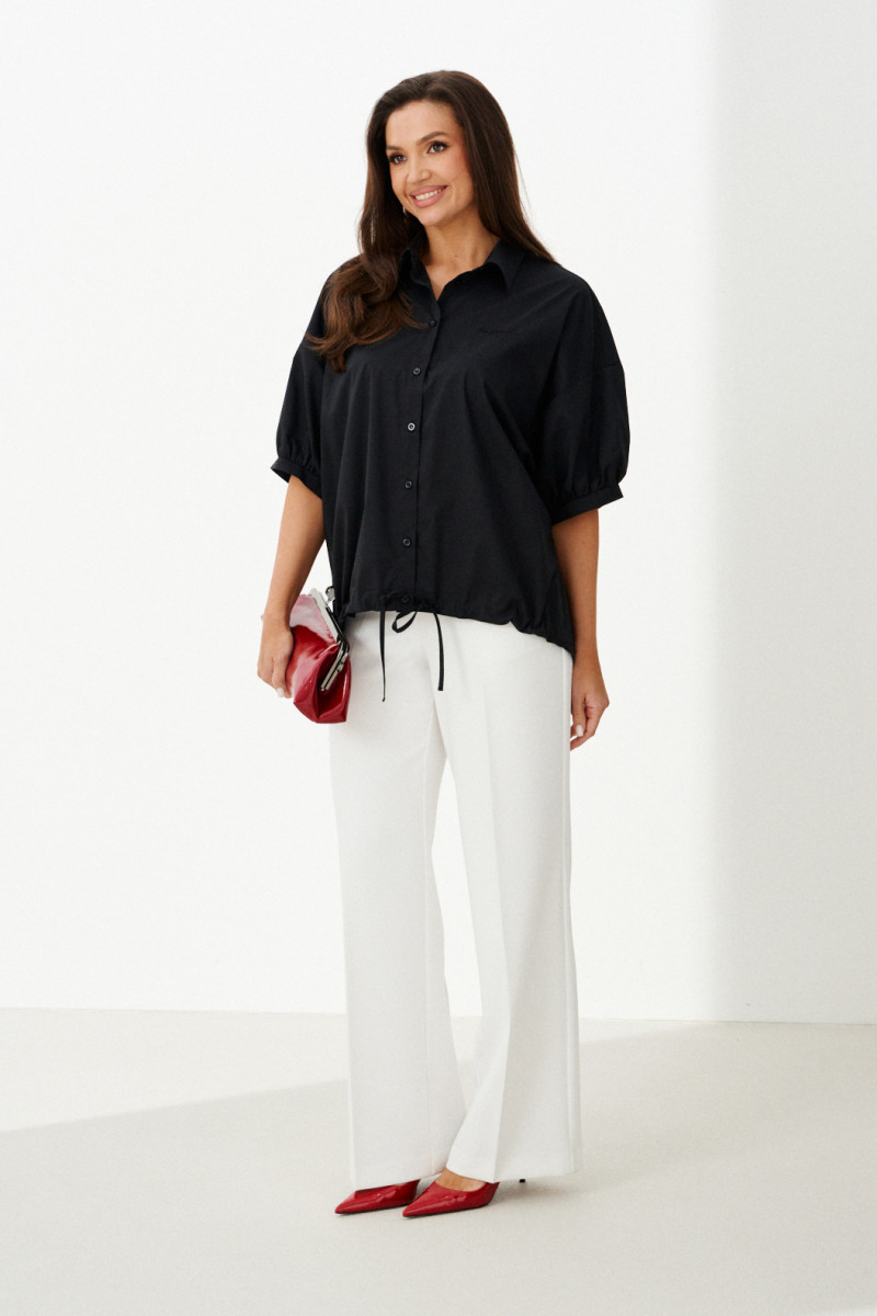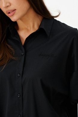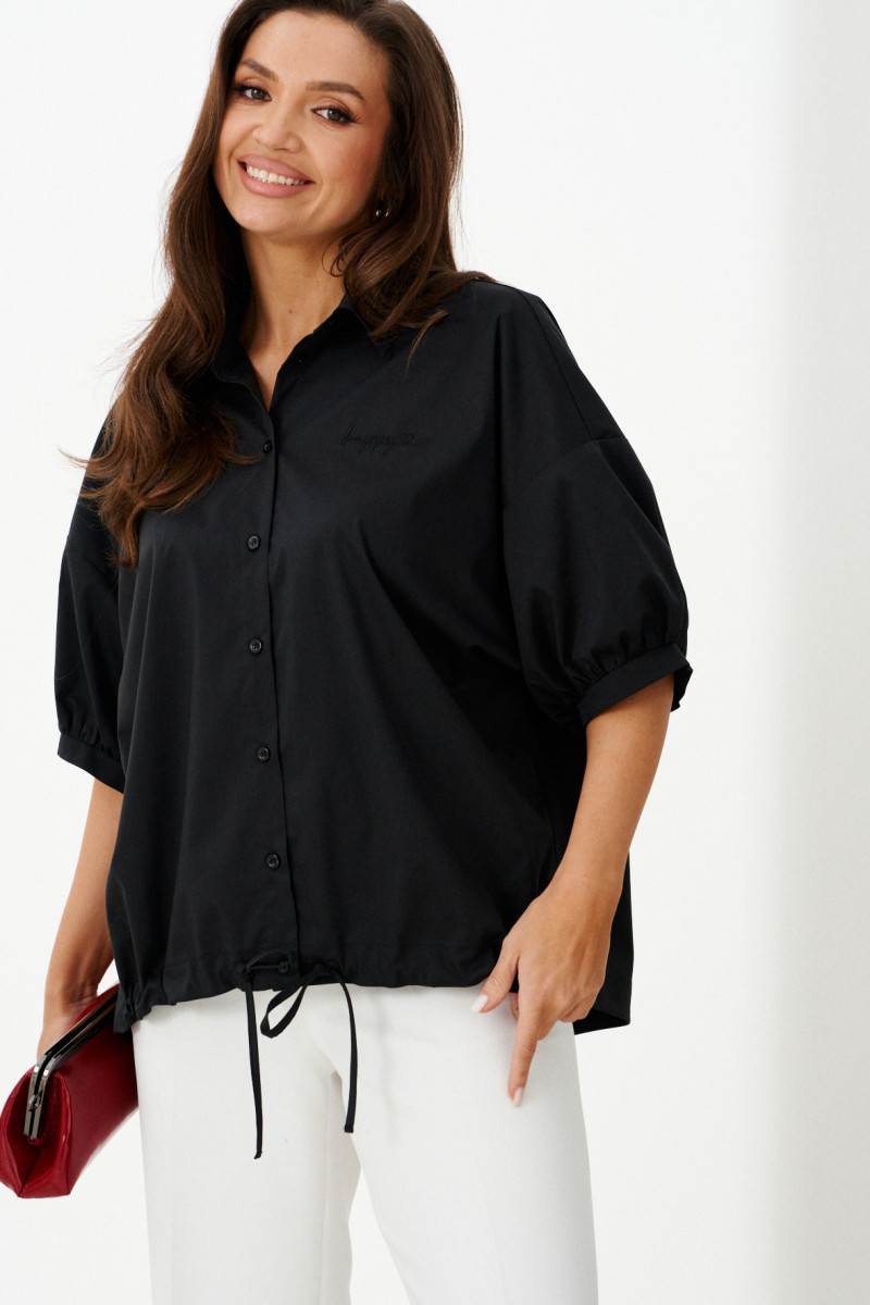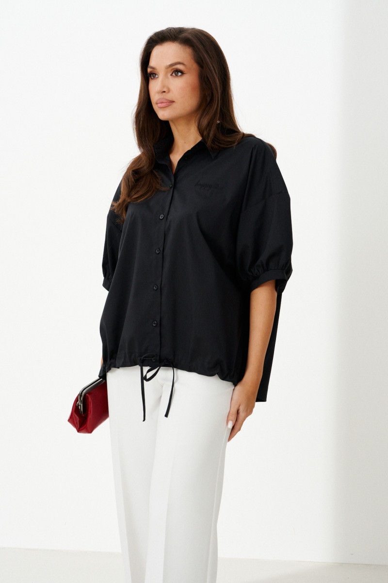 Женская блузка выполнена из смесовой ткани с высоким содержанием хлопка, что обеспечивает приятное ощущение мягкости и комфорта при носке. Модель имеет центральную бортовую застежку на аккуратные обметанные петли и пуговицы, придающую блузке классический и элегантный вид. Передняя часть украшена дизайнерской вышивкой в виде надписи, которая становится выразительной деталью и добавляет индивидуальности образу. Спинка модели дополнена кокеткой и складкой крест-накрест, что создает интересный силуэт и обеспечивает свободу движений. По низу изделия вставлена кулиса, позволяющая регулировать посадку и придающую блузке дополнительный стильный акцент. Горловина обработана рубашечным воротником, подчеркивающим универсальность и аккуратность модели. Линия плеча спущенная, что придает изделию легкую расслабленность и современный вид. Рукава втачные, длиной чуть ниже локтя, что делает блузку удобной и практичной. Нижняя часть рукавов оформлена притачной манжетой со сборкой, создающей легкий объем и завершающей изящный вид. Чёрный цвет блузки придает образу энергию и выразительность, делая её отличным элементом для создания стильных и запоминающихся комплектов.