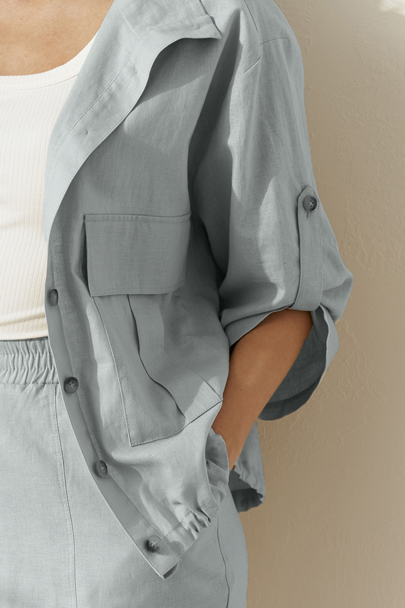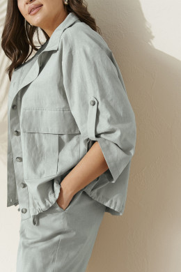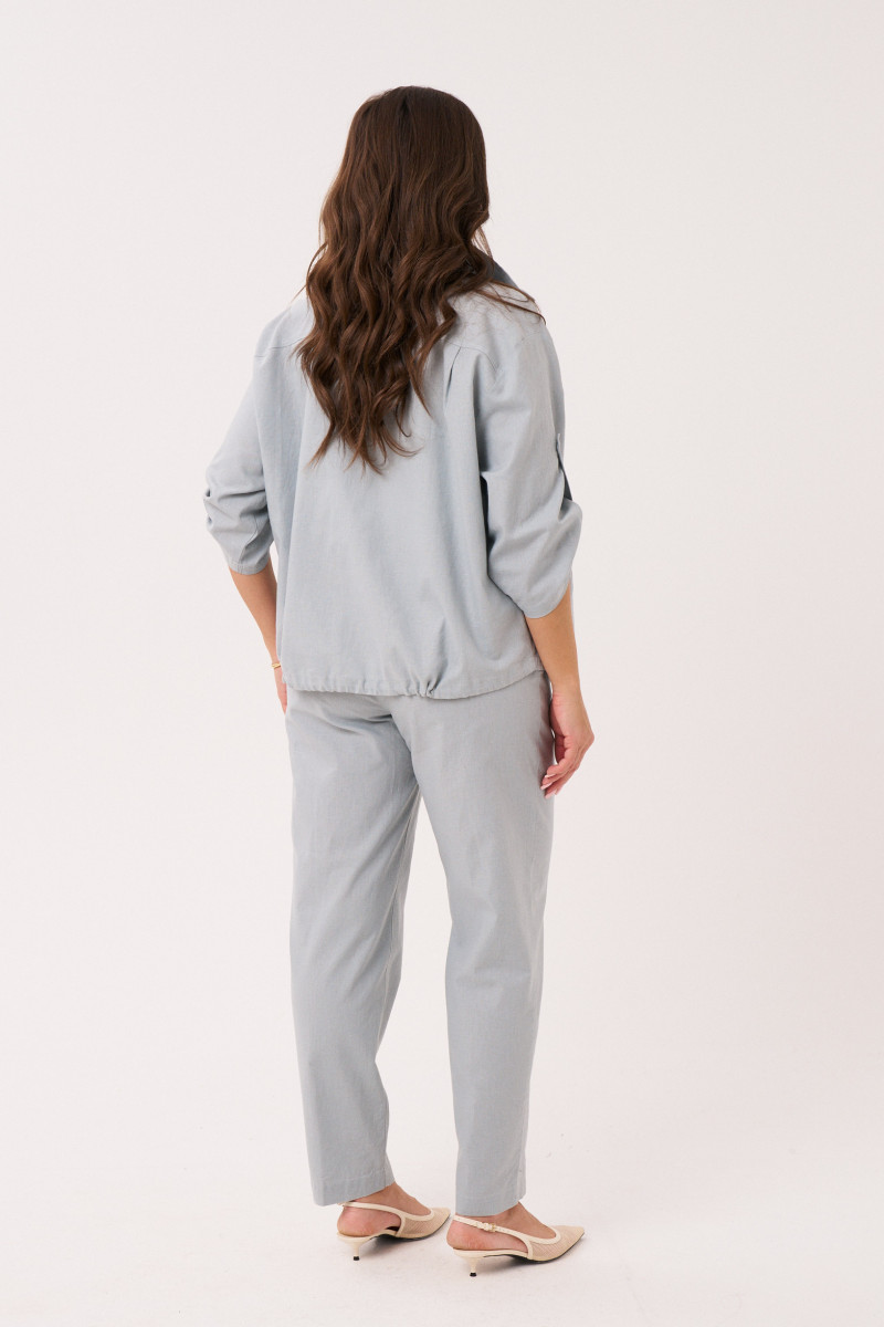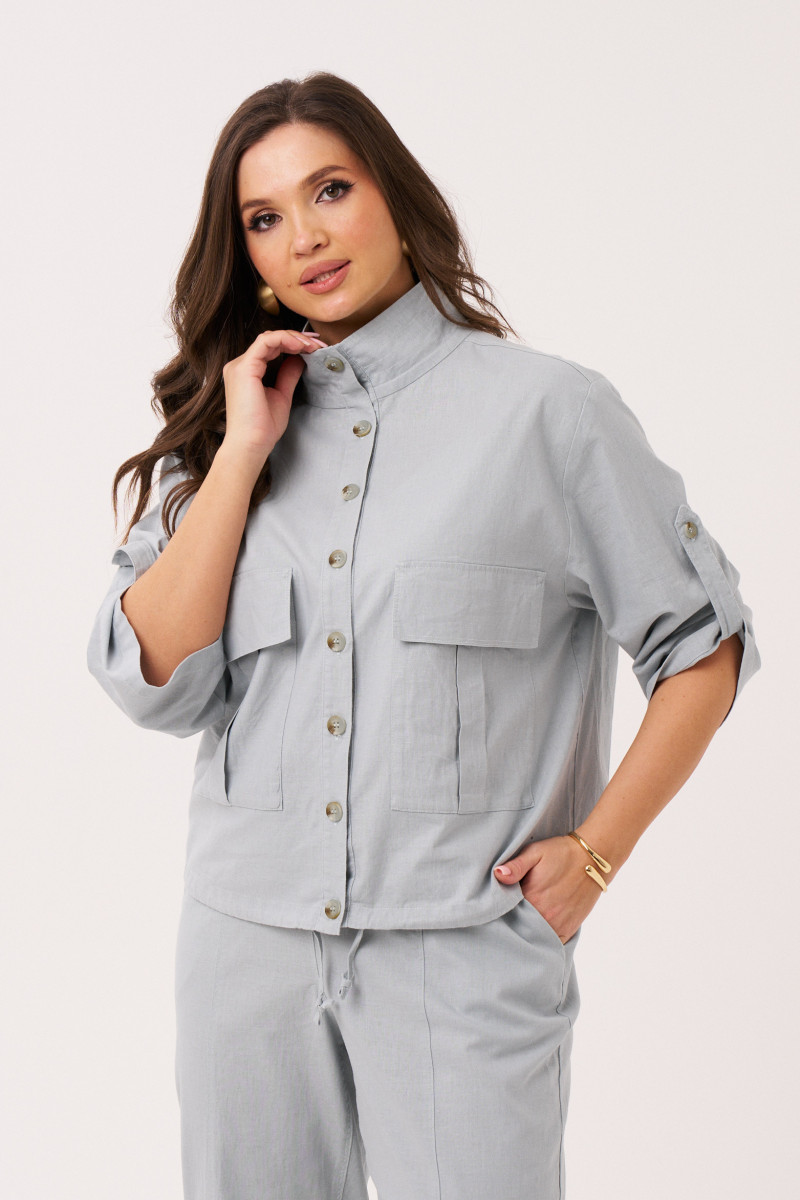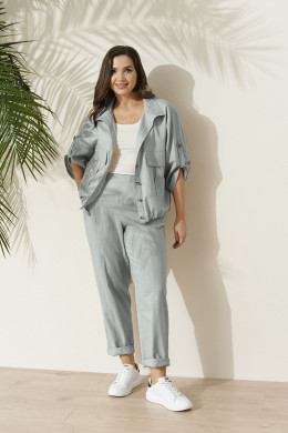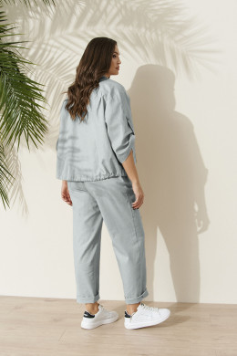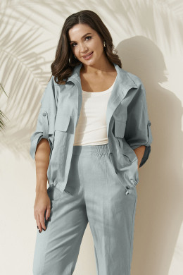 Комплект женский из льняной ткани с добавлением хлопка для повседневной носки. Комплект состоит из жакета и брюк. Жакет прямого силуэта. Застежка центральная на обметанные петли и пуговицы. Перед имеет два накладных кармана с клапаном. Спинка с кокеткой и двумя защипами. По низу изделия вставлен шнурок для регулирования облегания. Горловина обработана воротником-стойкой. Рукава втачные длинные, а также имеется пата с застежкой на одну обметанную петлю и одну пуговицу. Брюки женские прямые для повседневной носки. Верхний срез брюк обработан притачным поясом на резинке, по переду отрезная вставка без резинки. Передняя часть брюк с рельефами, идущими от пояса до низа изделия. В боковых швах имеется боковой прорезной карман с подкройным бочком. Очень стильный и комфортный комплект на каждый день, в котором вы обязательно будете чувствовать себя комфортно. А главное в данном комплекте вы будете выглядеть неотразимо.