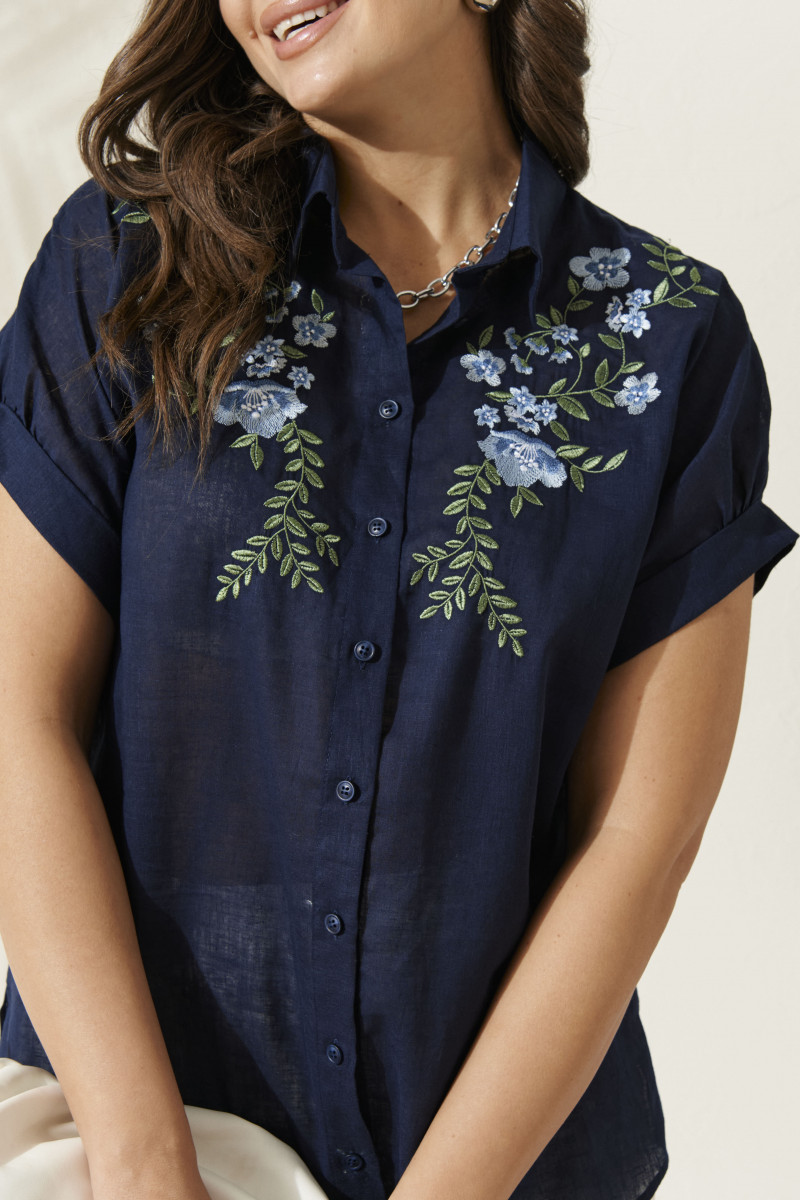Блузка женская из смесовой ткани прямого силуэта для повседневной носки. Блузка прямого силуэта. Застежка центральная бортовая на обметанные петли и пуговицы. Перед украшен дизайнерской вышивкой в виде красивых цветов. Горловина обработана рубашечным воротником с отрезной стойкой. Рукава цельнокроеные, низ рукава обработан отложной манжетой. Блузка с добавлением льна и хлопка отлично подойдет для жарких дней, а неотразимый синий оттенок будет добавлять красок в вашу жизнь. В данной блузке вы будете отлично смотреться, а уникальный дизайн обязательно будет радовать вас.
